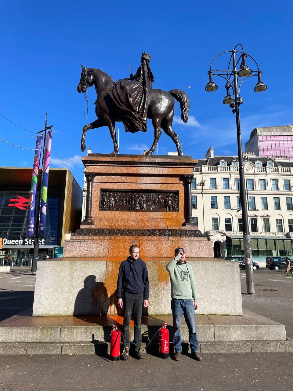 Two other organizers from This is Rigged staged another demonstration at the city's George Square on Monday, March 4, during which they hosed down the statues of Queen Victoria and Prince Albert with fire extinguishers full of soup. Neither were arrested or charged as Police Scotland reportedly did not consider the incident an act of vandalism.
