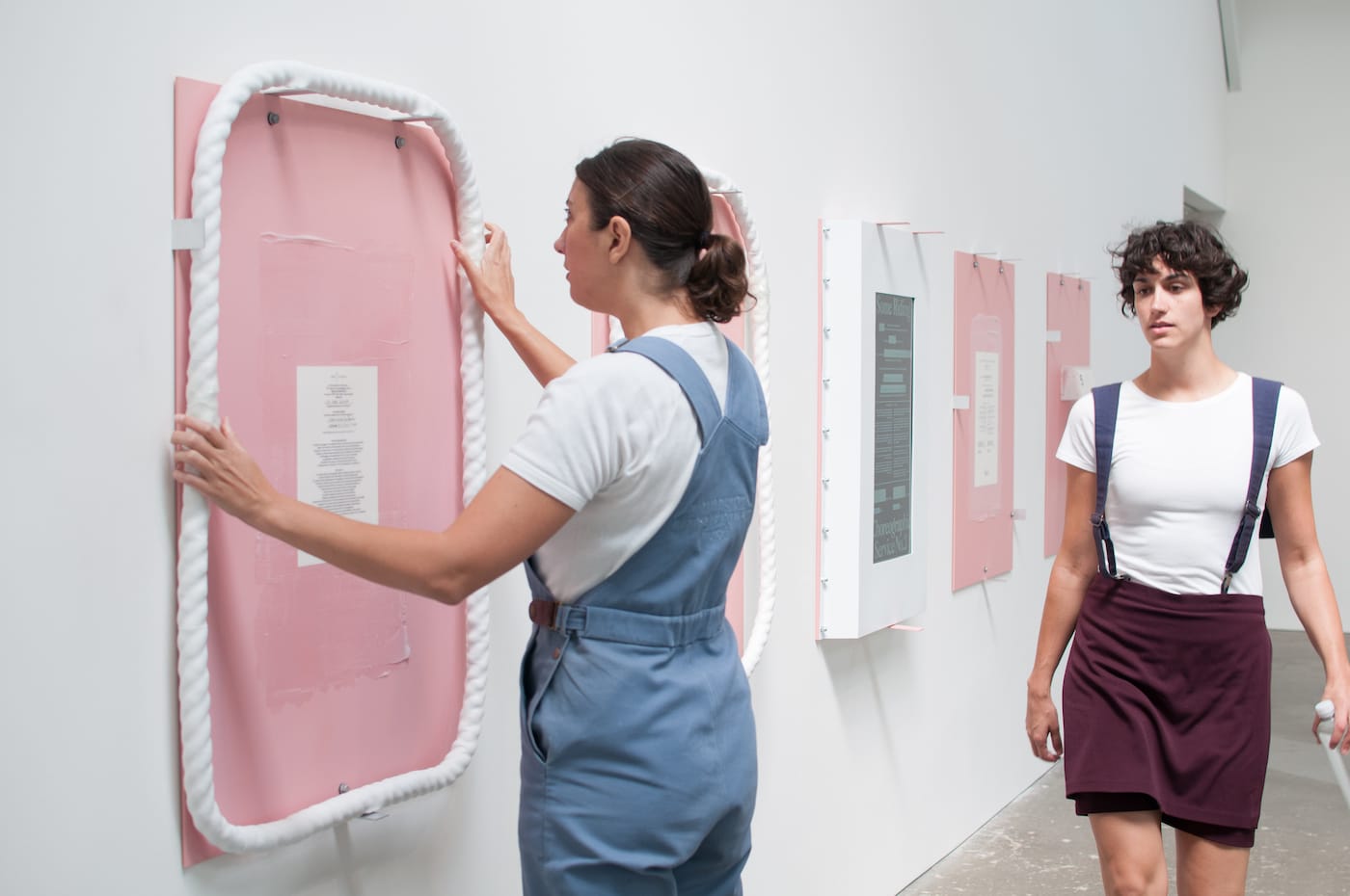 For three weeks, the dancers performed all afternoon, from 12 to 6pm, with an hour break for lunch. Large copies of the contracts for their services hung on the wall of the gallery, and the dancers clocked in and out, underlining the idea that this is labor. Sometimes, while the dancers were gliding, miming dusting and sweeping, they were performing to an empty room, except for the employees at the Wattis, sitting behind a desk at the entrance of the gallery.