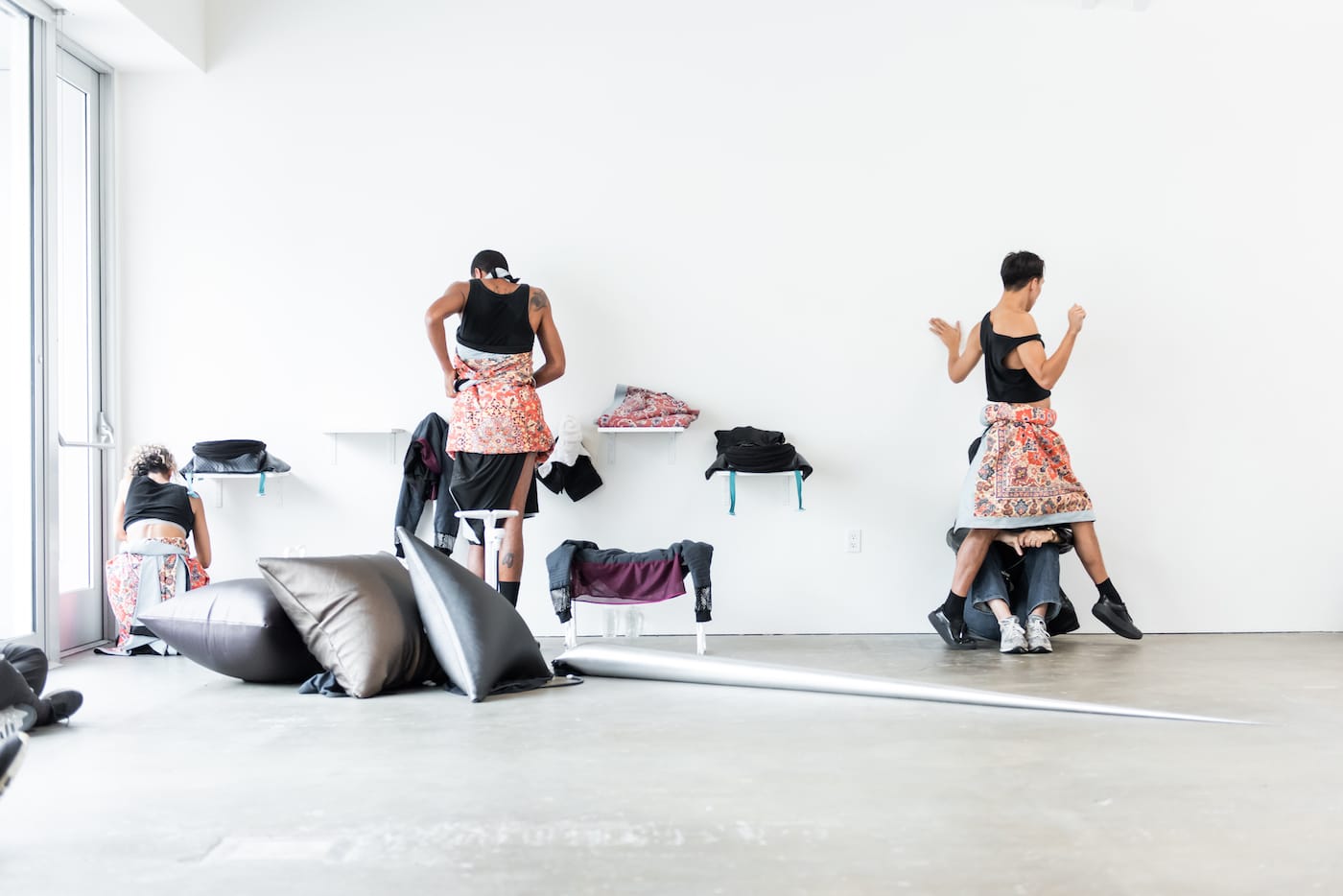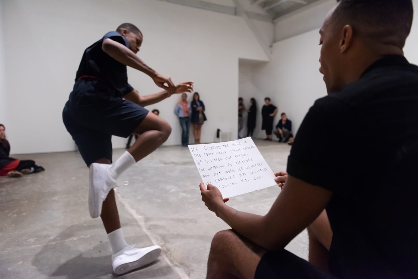 During the three weeks, the dancers performed the services on a rotating schedule, and sometimes multiple were carried out at the same time. During “Some Riding,” Linder and another dancer went about the front of the gallery reciting essays by Sarah Lehrer-Graiwier and Catherine Damman about performance and embodiment, while a single dancer in “Some Cleaning” mimed sweeping in the corner. At the same time, two dancers in “Some Proximity” were gliding around the back room.