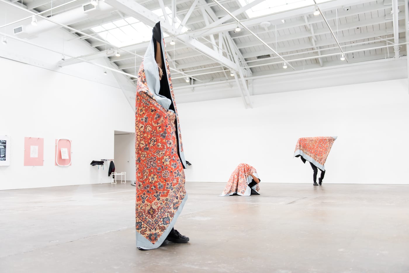 While some elements of the performance directly reference physical labor, others feel like sly commentaries on a visitor’s experience at a museum. In “Some Strands of Support,” Linder and another performer groom and caress a statue made by San Francisco artist Charlie Leese, and in the most non-narrative performance of all, “Dare to Keep Kids Off Naturalism,” four dancers created different scenarios, lying under what looked like Persian rugs while hugging the wall. Visitors to the gallery stood around the room, or sat on the floor, some of them eating their lunch or a snack.