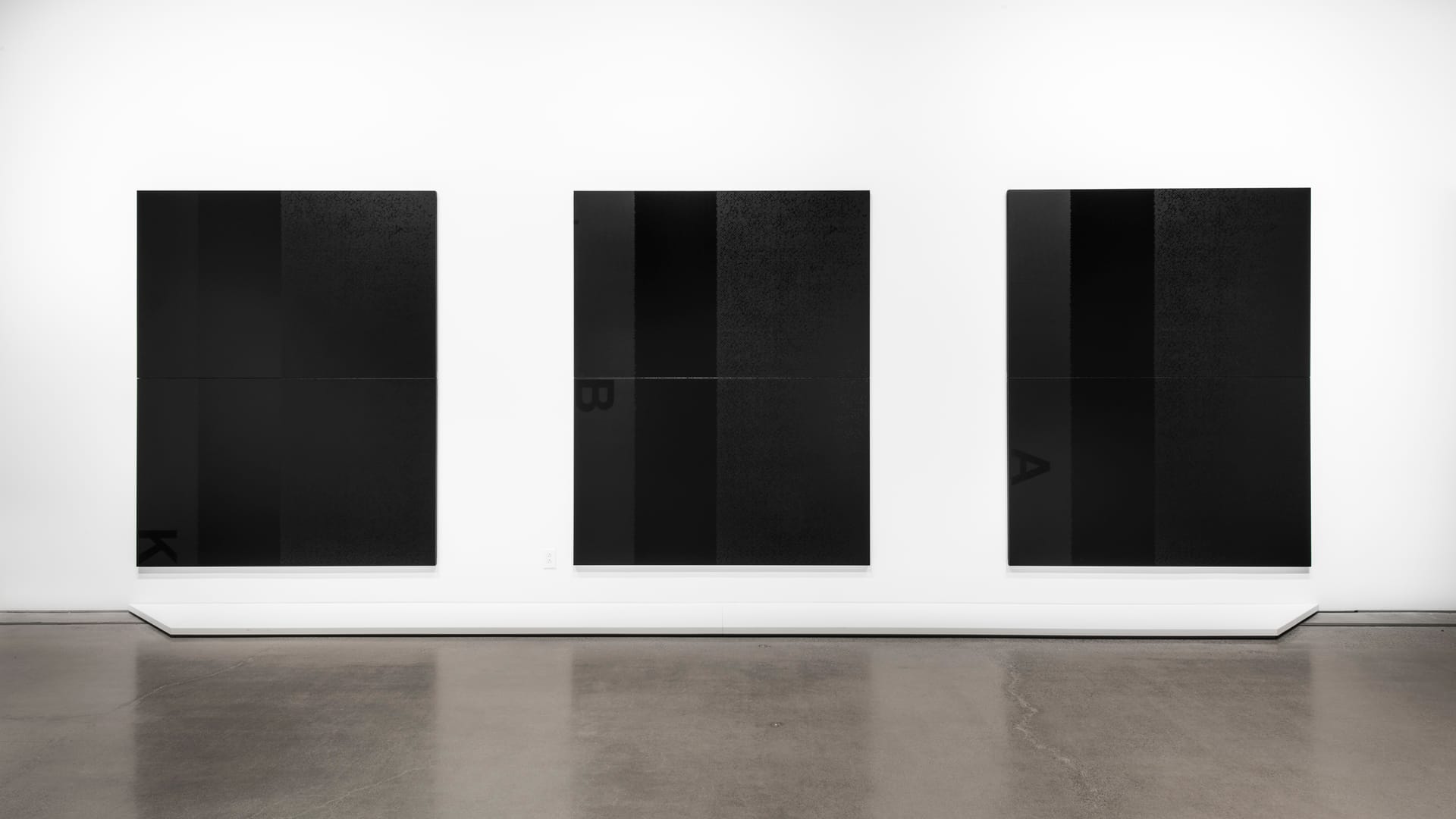 Pendleton’s fragmentation of black images reflects blackness as incomplete, in motion, and the artist works to disrupt space that presents a logic of identity related to blackness. For example, the Black Dada series of silkscreens on canvas appropriate and fragment Sol LeWitt’s “Incomplete Open Cubes” onto segmented, striped black canvases and evoke “black” through the isolated letters “B,” “A,” and “K.” The sheen of the deep, dark black reflects light in a way that makes the letters and color gradients barely discernable, depending upon your viewing perspective.