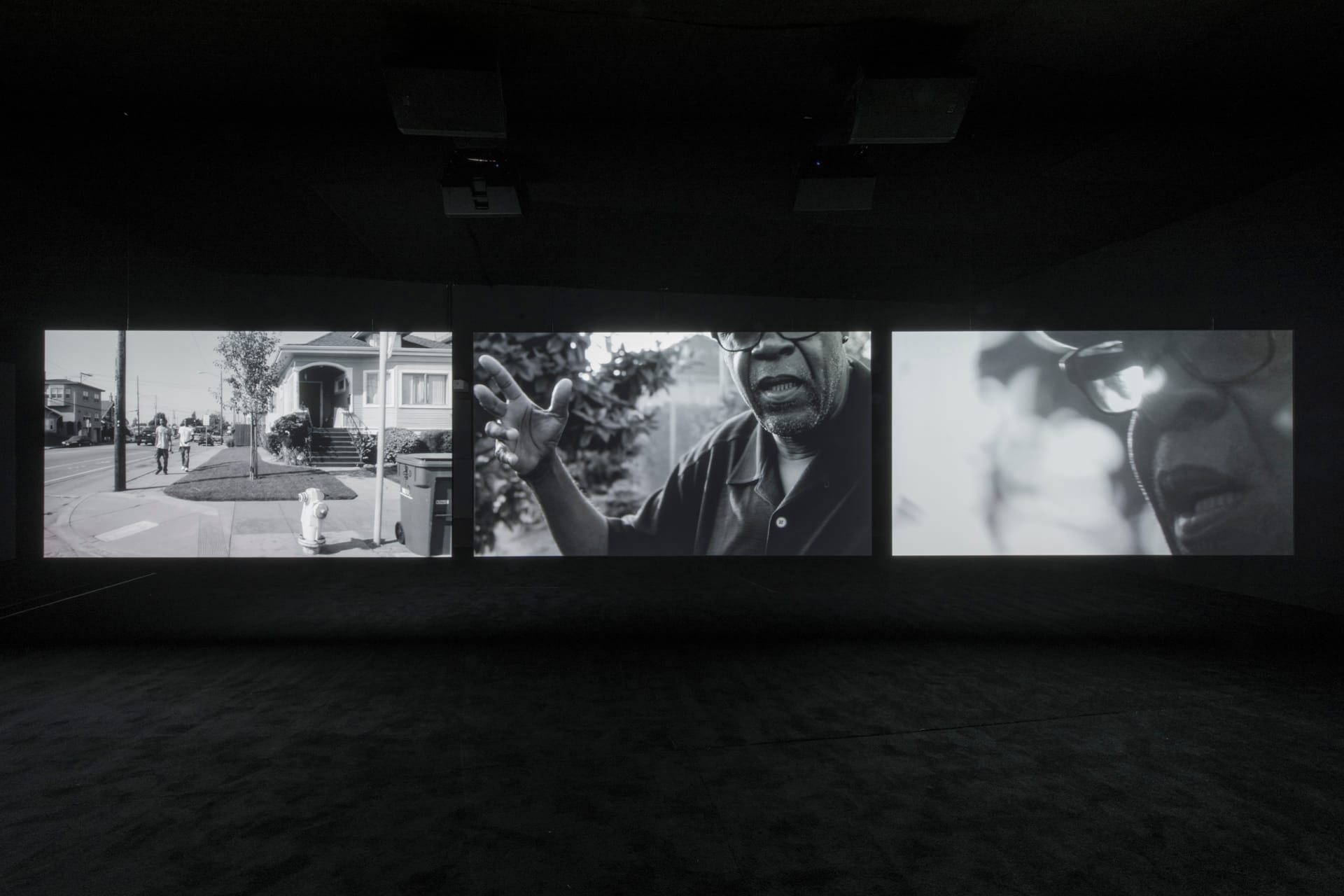 This multiplicity in representation is reified in “My Education: A Portrait of David Hilliard” (2011–14), in which the former Black Panther leader’s straightforward narrative becomes a layered and complex history through a three-channel video presenting simultaneous perspectives. “Untitled (1958)” (2016) is a détournement of the representation of the Civil Rights movement. In the center walks Martin Luther King Jr. accompanied by two other Civil Rights leaders, but the iconic photograph is broken down into nine parts, with illegible words written over the image. The fragmented work suggests that the narrative is incomplete, and the piece’s reflective Mylar background invites self-recognition, self-reflection, and a multiplicity of perspectives.