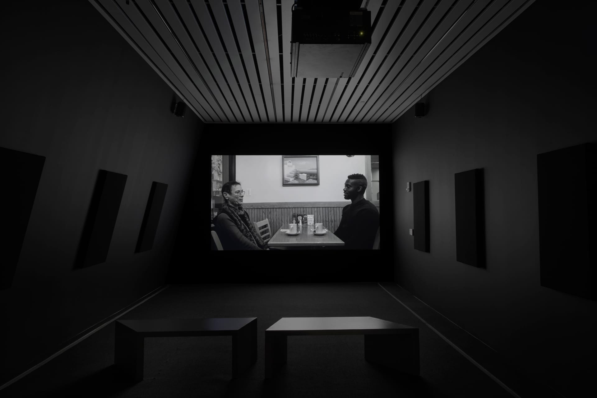 The black and white single-channel film Just Back From Los Angeles: A Portrait of Yvonne Rainer is the most powerful piece in the show. It documents an exchange, both unscripted and scripted, between Rainer and Pendleton during a meeting at the Ridgeway Diner in NYC’s Chelsea neighborhood. One of the most moving parts of the film is when Rainer reads a text Pendleton prepared for her that mixes words from Stokely Carmichael, Malcolm X, Keeanga-Yamahtta Taylor, antiwar poet Ron Silliman, and Rainer’s own published works. Laid over fragmented images of Pendleton and Rainer sitting in the classic ’50s diner and Rainer’s 1966 minimalist dance “Trio A” is the Silver Harps’s gospel song “I Am Saved” and Rainer & Pendleton’s voices. The film travels through multiple periods of time and encourages deep contemplation of the past, present, and potential future of civil rights in the US. Listening to Rainer’s steady, slow reading, particularly of Taylor’s description of police killings of John Crawford, Michael Brown, Tanesha Anderson, and Tamir Rice, while watching her, a white woman, dancing in black, arms behind her back, rolling on the floor — it creates an alienated and moving experience of the brutality and trauma being plainly described. Rainer concludes by reading her own words: “I remember the breathlessness of the lifting section … I remember … you grinning at the pleasure we had.” Viewing the film in Cleveland, the site of several of the police killings described, amplifies the work’s urgency and potency, creating a simultaneously overwhelming and transcendental experience.