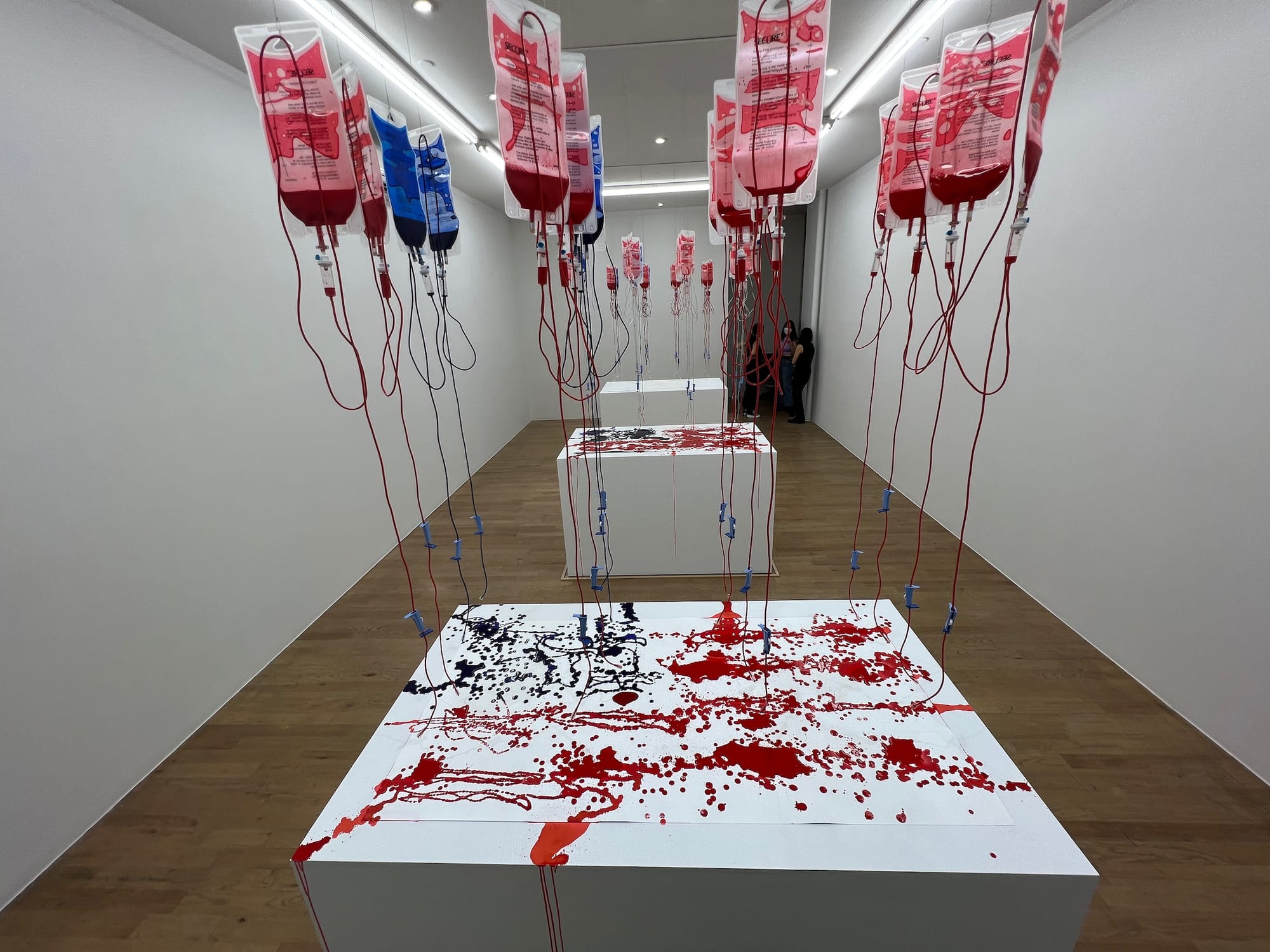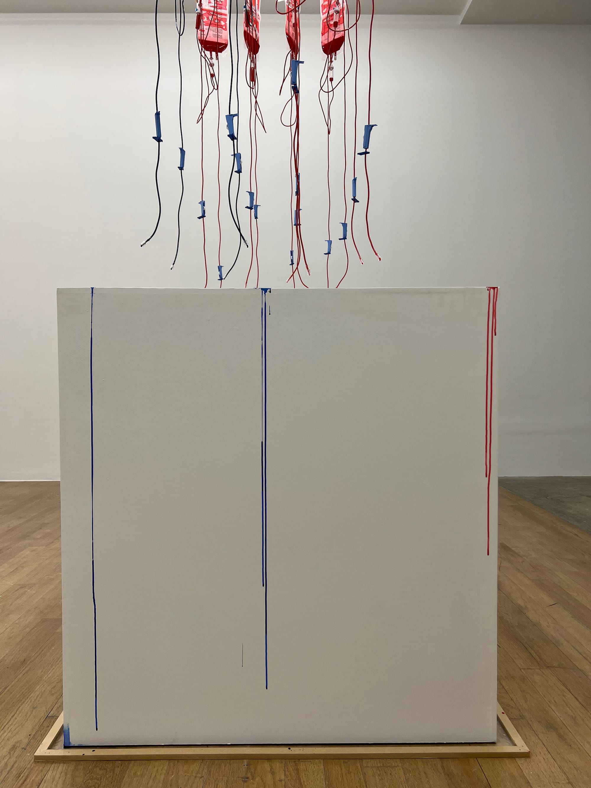 While Jasper Johns’ now iconic “Three Flags” (1958) hangs in a gallery at the Whitney Museum for that artist’s retrospective, artist Addie Wagenknecht has created her own three flags across town at Bitforms gallery. Using an array of intravenous bags dripping red and blue pigment on sheets of paper atop white plinths, Wagenknecht is mining the language of American modern and contemporary art, while offering a visual representation of its fragmentation.