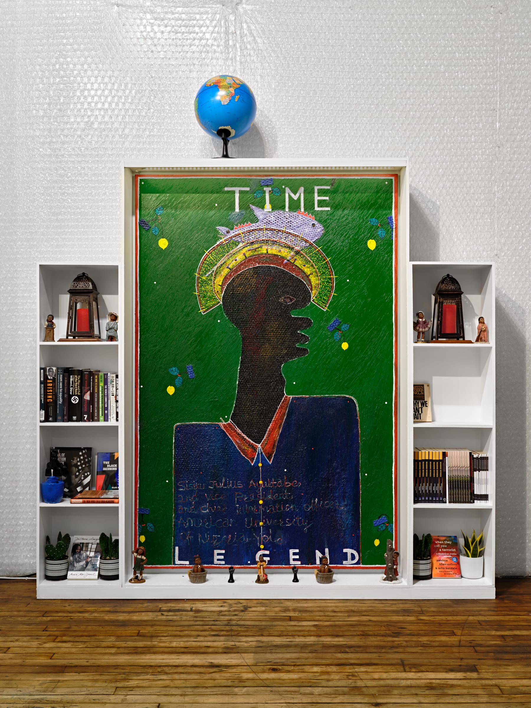In merging Afro-Expressionism and Surrealism, Okpu-Egbe pushes historical materialism into the realm of spiritual meditation. In "Sisiku AyukTabe, the Martin Luther King Jr. of Ambazonia" (2021), he crowns the first president of the Federal Republic of Ambazonia on an imagined cover of Time magazine. The Federal Republic positions itself outside the Françafrique influence and remains internationally unrecognized, making it unclear whether the inclusion of this corporate magazine aims to be devotional or ironic. Further, portraying AyukTabe as the "Martin Luther King Jr. of Ambazonia" begs the question of what the late Civil Rights leader might have accomplished if he had the chance, and whether mainstream media would have treated him the same.