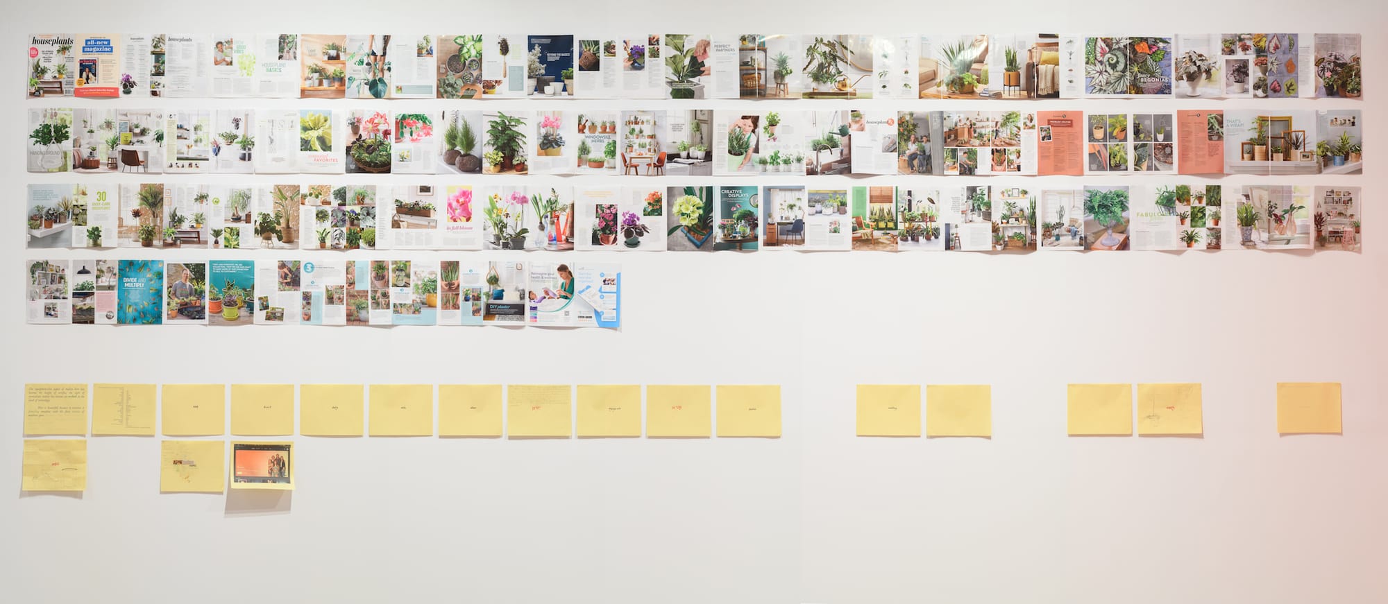 On a windowsill, the artist organizes a display of living plants and dried flowers with rose quartz, amethyst, incense and palo santo, jewelry, and brass candlesticks — all underscored with framed pieces of annotated yellow paper along the wall below. A toy knight beside a potted Devil’s ivy plant named Hannibal brings to mind the armored portraits of Lorraine O’Grady, while the overall presentation recalls the renewed interest in ecofeminism by conceptual artists. On the catercorner wall, a series of pages extracted from Better Homes and Gardens features dozens of pictures of plants and white people — with the aforementioned map of Africa separating the two installations. The latter work, titled Better homes and gardens back by popular demand (2021), evokes the insurmountable gardening media that advances gentrification