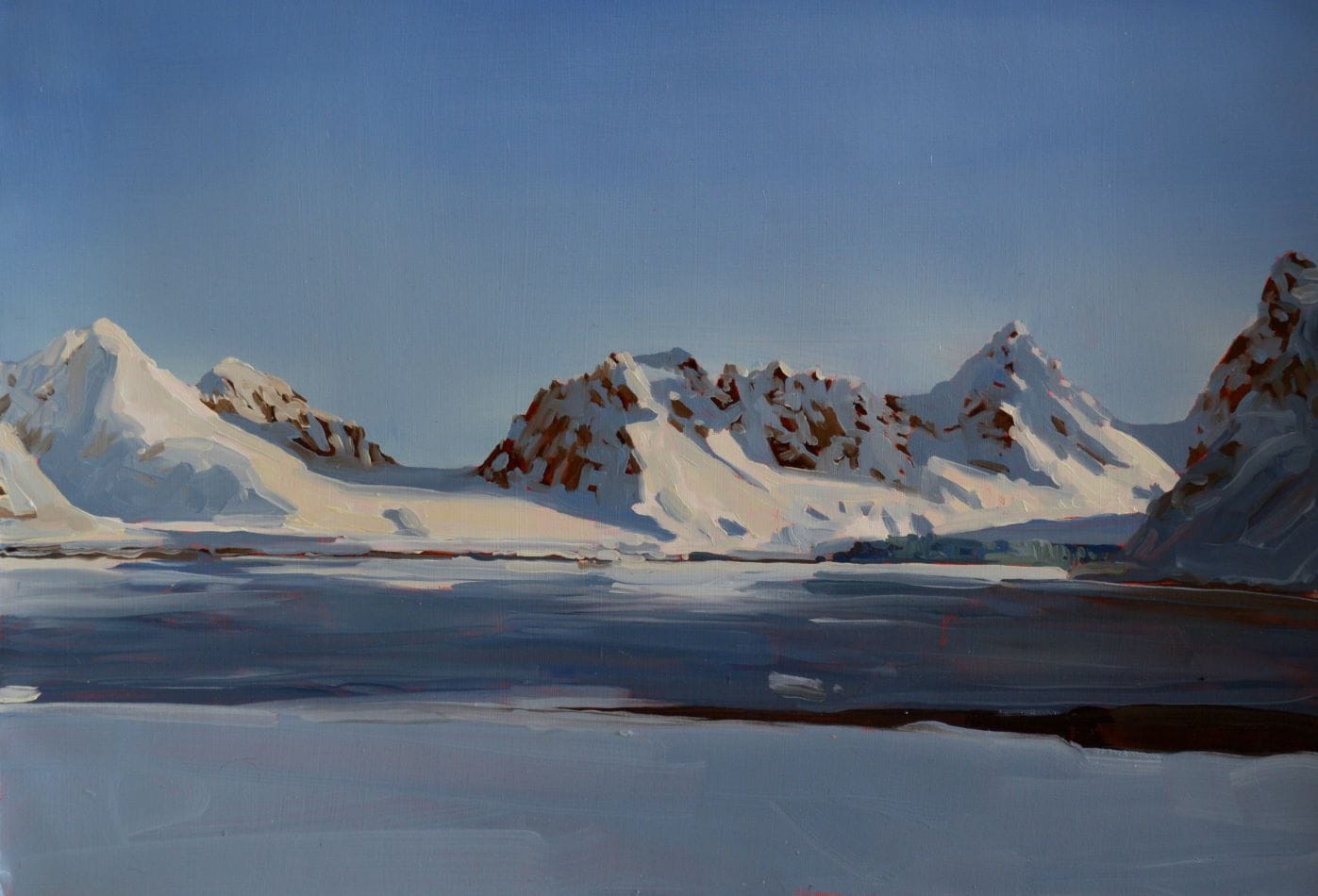 Beau Carey, also a Wilderness Studio alum, sometimes joins them. “Wilderness Studio changed the direction of my practice,” he says. Carey favors remote, icy corners of the world: the mountains of Longervin, Norway, and Denali National Park. He believes that working in the field is a great way to engage with a space, to record a subject with as much accuracy as possible under changing conditions before reinterpreting it in the controlled conditions of the studio. Stine, in fact, calls her outdoor studies “recordings.” DeFeo calls his “snapshots” or “souvenirs.”