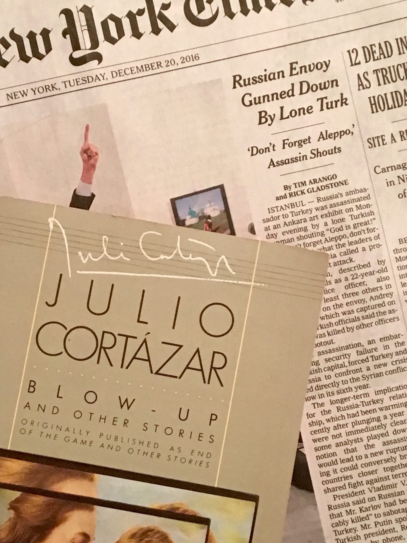Eerie — that’s the word for them, those photos of the Russian ambassador assassinated in an Ankara art gallery. Perhaps it’s because I’ve been reading Blow Up, Julio Cortazar’s short story collection from 1968. . In many of those stories characters try to keep the world at an aesthetic distance, only to find that distance collapse. Or perhaps I’m just disturbed because we are entering very dangerous times just at the moment when a spectacularly unsuitable person is taking control of the most powerful nation on earth. But I think there’s something else at play, too — I think a large part of my inability to fully process the images from Turkey has to do with a kind of category error. They should, I tell myself, be documents of an atrocity, the kind of images we’re bombarded with all the time, and to which most of us have, perhaps at some cost to our humanity, developed antibodies. We see mediated atrocity every day. We tell ourselves we care, and perhaps we do. But generally we look at the wreckage, the carnage, the suffering faces, and we move on. This time, though, I’m having a hard time moving on, because I don’t just see the images as documents of atrocity. I also see them as aesthetic, and that doesn’t sit easily with the other way of seeing them. Indeed, it feels immoral. It feels wrong.
