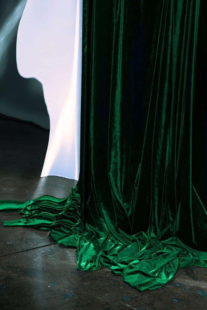 Before you even walk through the rectangular freestanding walls into the curated section, you’ll encounter the photography of The Aesthetics of Matter‘s first artist, Christie Neptune, represented by Rubber Factory. The Brooklyn native’s conceptual photography and video series, Unpacking Sameness, takes its inspiration from James Baldwin and Frantz Fanon. Neptune addresses the ideologies around white supremacy by focusing on an artistic invention called “The Colorline,” a metal stand and green velvet curtain, “designed to block out the reality of systematic racism, cultural and racial difference, white supremacy, and aggravated stress caused by interactions with non-white persons.” Behind the curtain, a comfortable delusion of overarching equality awaits.