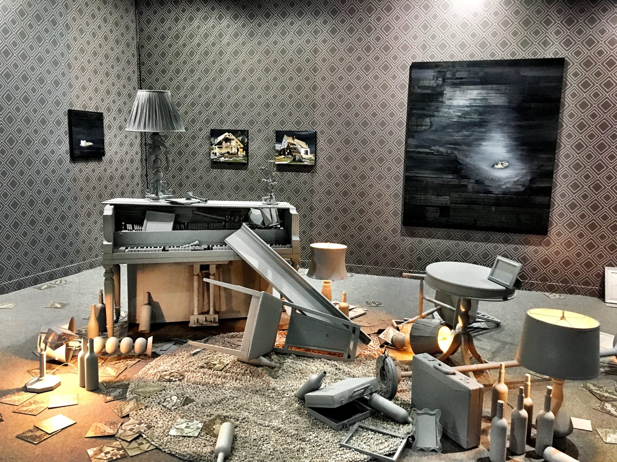 Although The Aesthetics of Matter effectively stole the show at Volta, I would be remiss to exclude a couple of standout booths. In the first, Bratislava’s Soda Gallery presents the works of Lucia Tallová, who uses old family photographs and furniture to create monochromatic installations highlighting the unreliable nature of memory. At the booth of São Paulo’s Galeria Emmathomas, gray paint covers the chaos of a broken piano with bottles, lamps, and chairs littering the floor, an installation by Alan Fontes that almost feels like a Cubist still life in 3D. Behind the installation, on the gray wallpapered walls of the booth, hang paintings of crumbling houses.