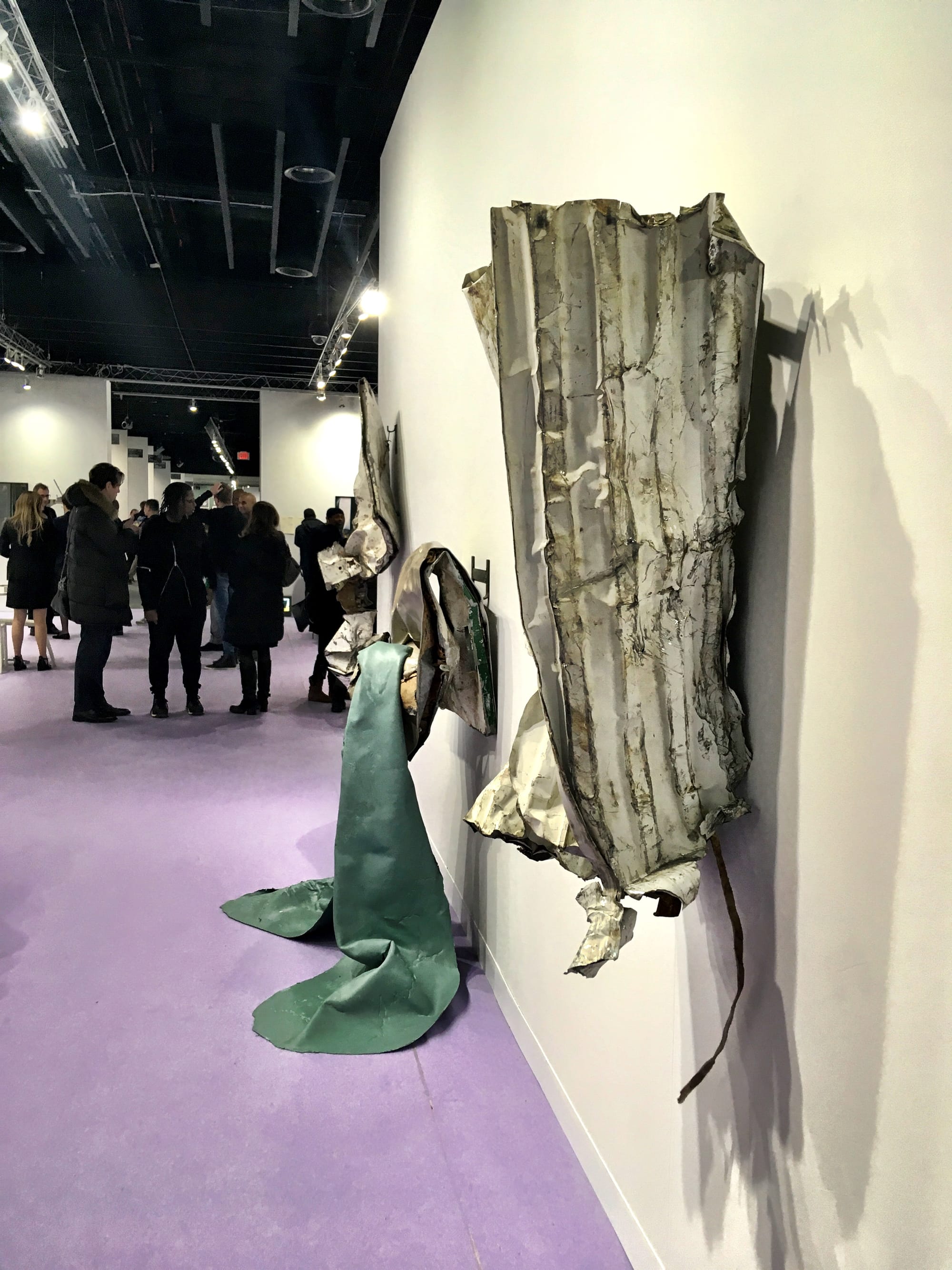 In the middle of the curated section, Brooklyn’s new Jenkins Johnson Gallery takes up two facing walls, with photographs and mixed media work by Devin N. Morris and wallhanging sculpture by Kennedy Yanko. Morris explores racial and sexual identities through large-scale collages and photographs that create an aura of 3D collage, often combining them into a single installation. On the side of one wall, he installed a photograph of a man standing outside a house, his legs covered by a broken door and chairs hanging precariously out of windows; in front of the photograph, two completely different broken chairs are recombined into one. As with Shrobe’s works, this recombination is symbolic of a reimagined history (and future).