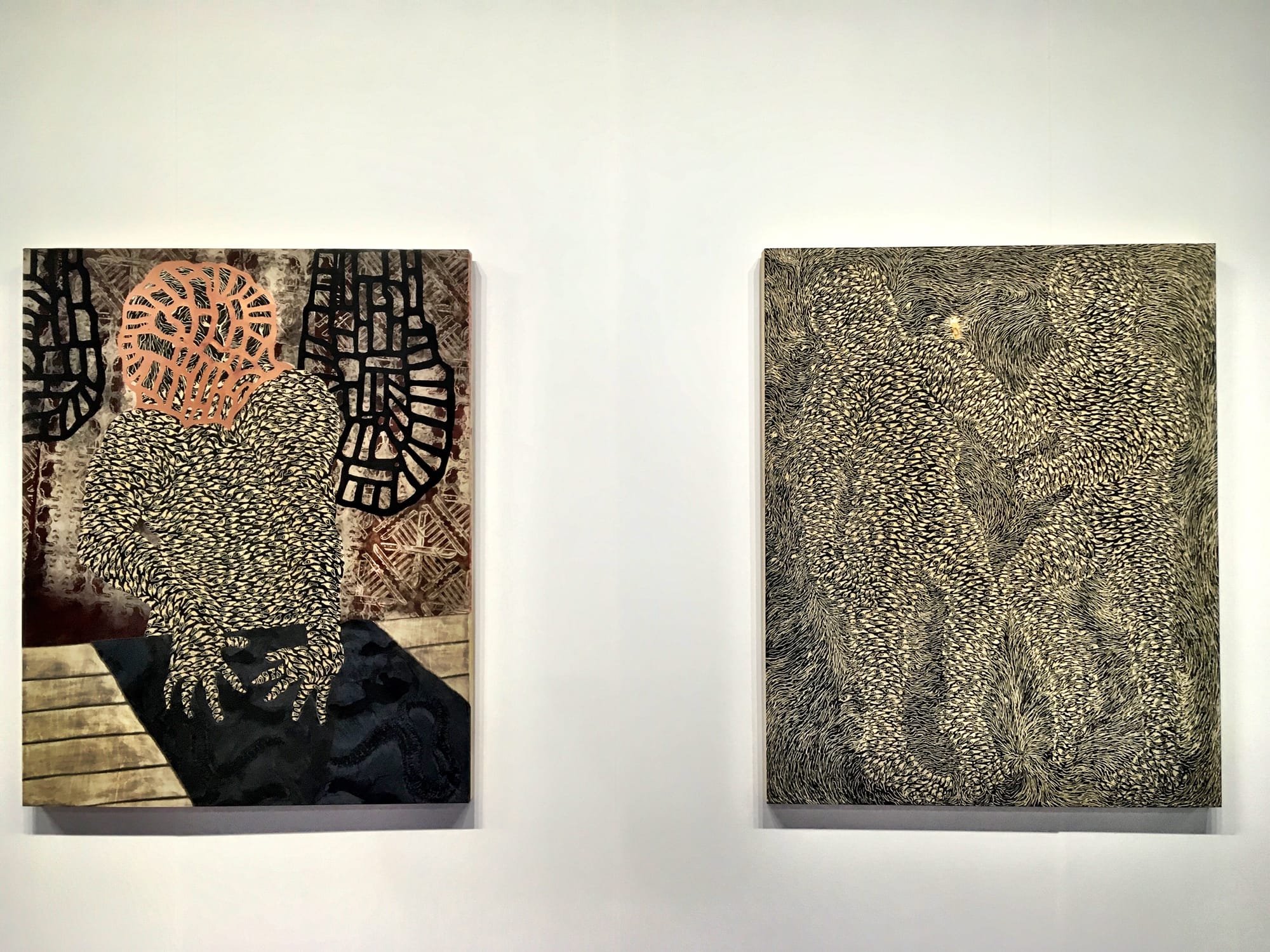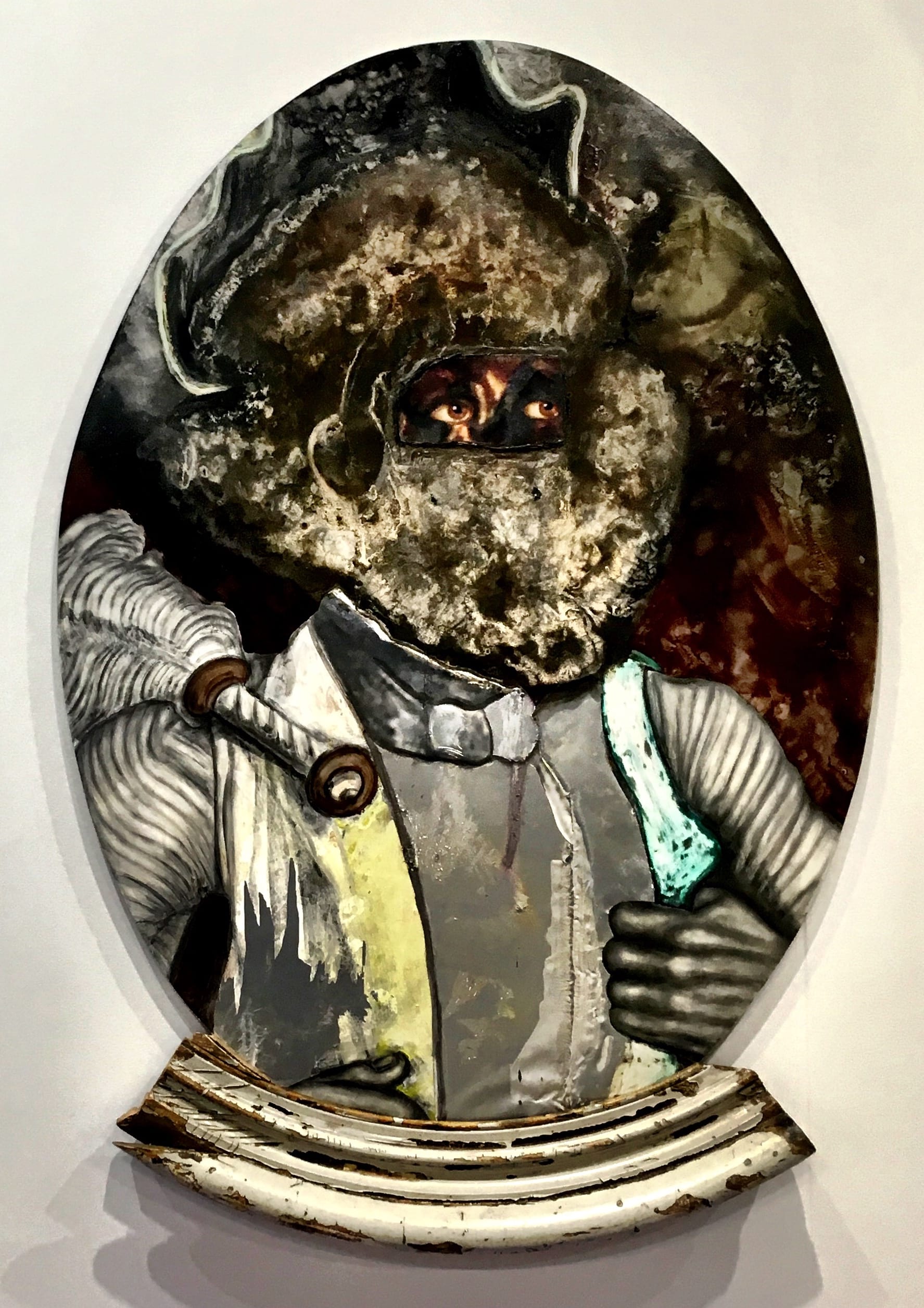 Adjacent to Neptune, hanging on Studio 301 NYC‘s wall are the bricolage sculpture/paintings of David Shrobe. Unique takes on classical portraiture created from reclaimed detritus (like pieces of chairs, linoleum, doorknobs, and wallpaper), Shrobe’s works often include only fragments of the faces of his “sitters,” their collaged torsos surrounded at least partially by old frame fragments. Through the amalgamation of various found objects with their own separate backstories, Shrobe symbolically fuses and recombines their historical narratives. Opposite Shrobe, Anna Zorina Gallery presents Haitian-American artist Didier William, who draws from Vodou symbolism in his depictions of writhing bodies engulfed in swarms of eyes, ripped pieces of painted paper collaged into the background. Carved straight into the wood panel, the eyes look as if they’re almost poking at the distorted bodies, causing them to buckle and at times even dissipate into the wood itself.