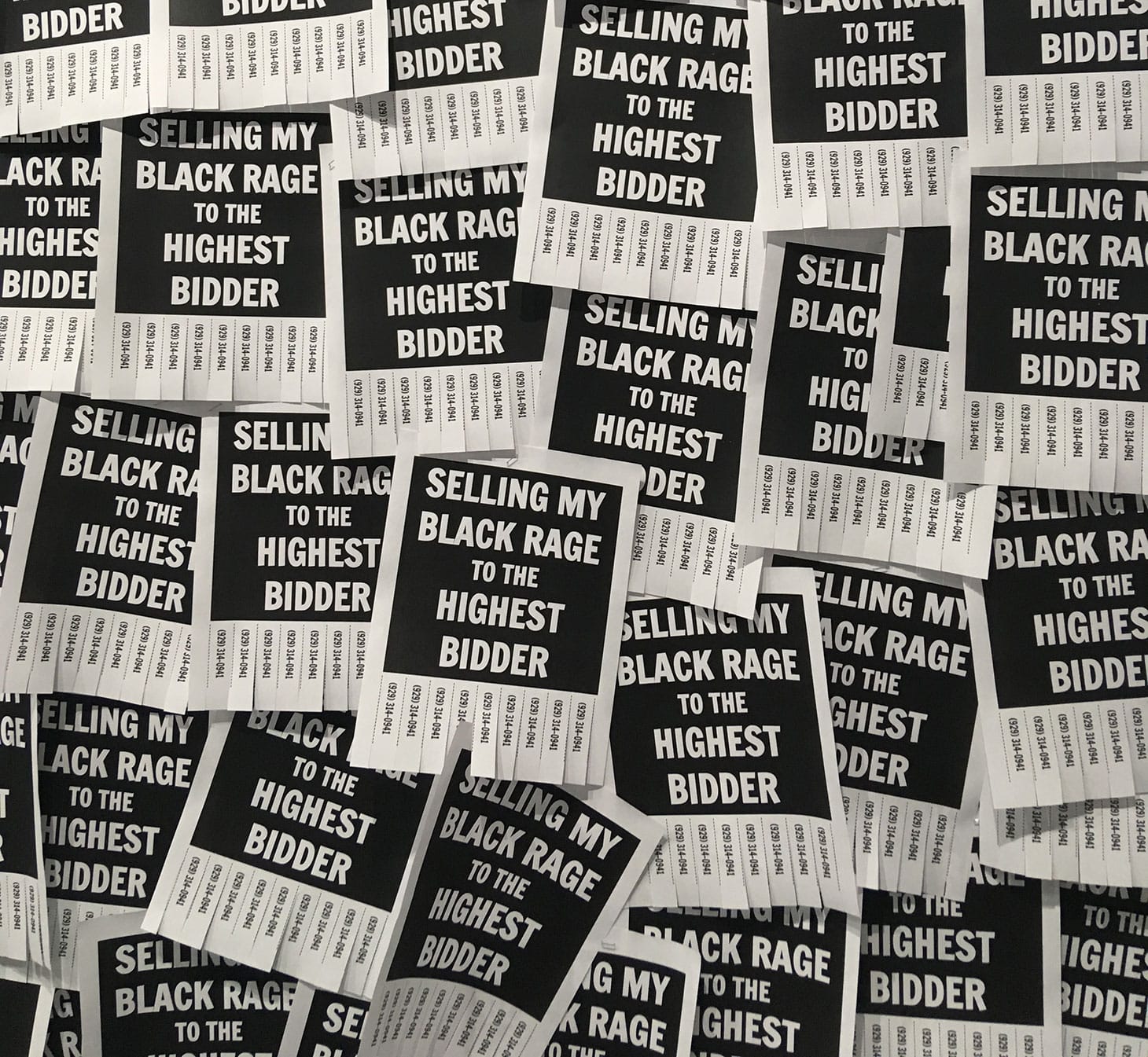 The final artist in this section, Kameelah Janan Rasheed covered one side of Project for Empty Space‘s wall with “Selling My Black Rage to the Highest Bidder” flyers with pull-off tabs printed with a phone number. (If you call, you can leave a voicemail with your bid, which as the automated greeting informed me, starts at $100.) On the other side of the wall, Rasheed arranged black-and-white cut-outs, clippings, and xeroxes of seemingly random words and phrases that transform into poetry. Reading the snippets of text in all directions creates infinite combinations and meanings with every glance, suggesting an inherent complexity of language and understanding, both literally and in the abstract.