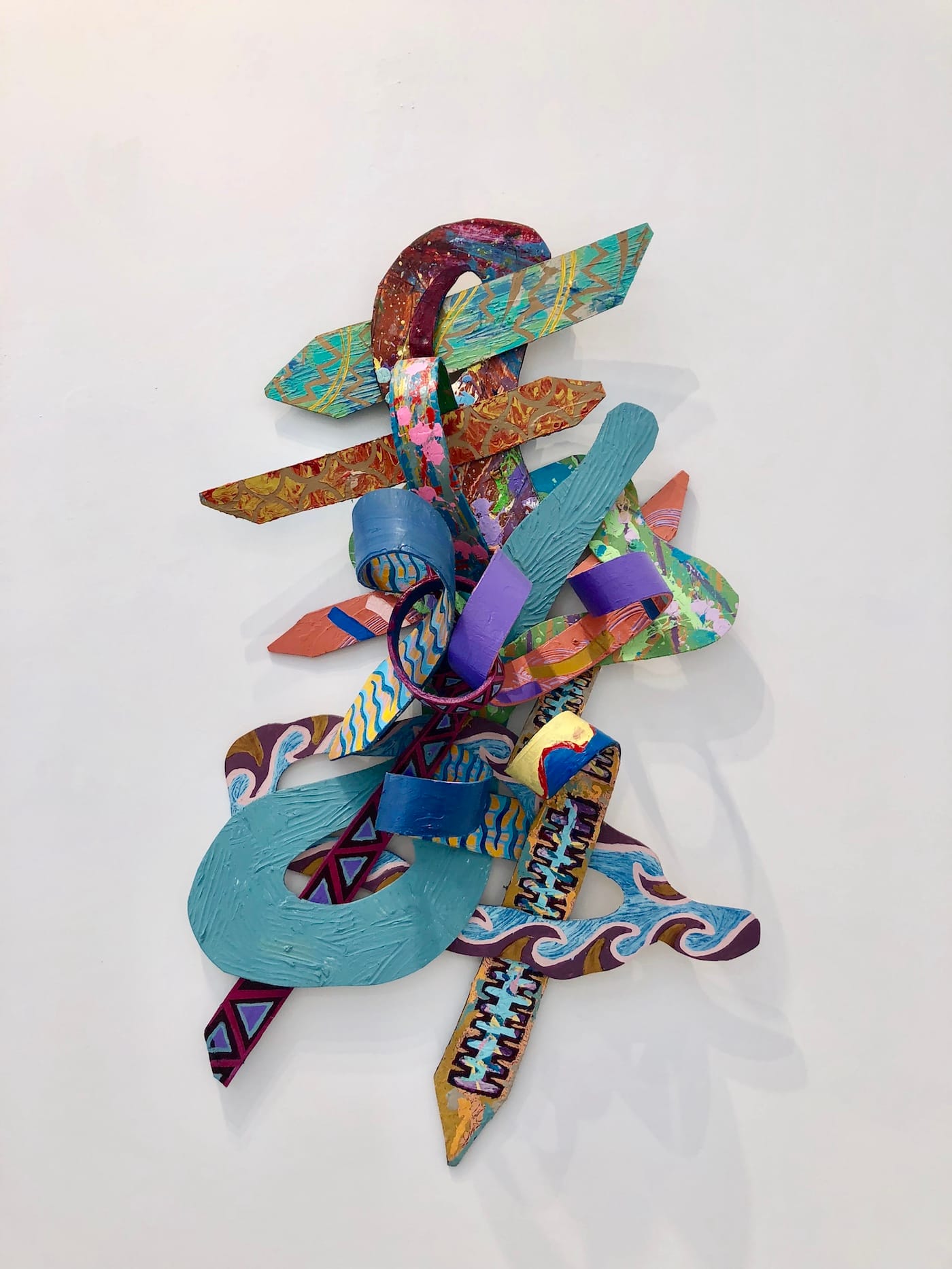 A few works stand out as unusual. Jeff Donaldson’s “Victory in Zimbabwe” seems out of place among all the textured, figurative works. The piece itself, a beautifully executed scene of Egyptian figures intricately constructed from colored bits of cardboard, is held behind a frame. Works covered in glass feel unfit—they hang guarded and uninviting amid the collection of tactile art objects, their textures protected from unfettered interaction.