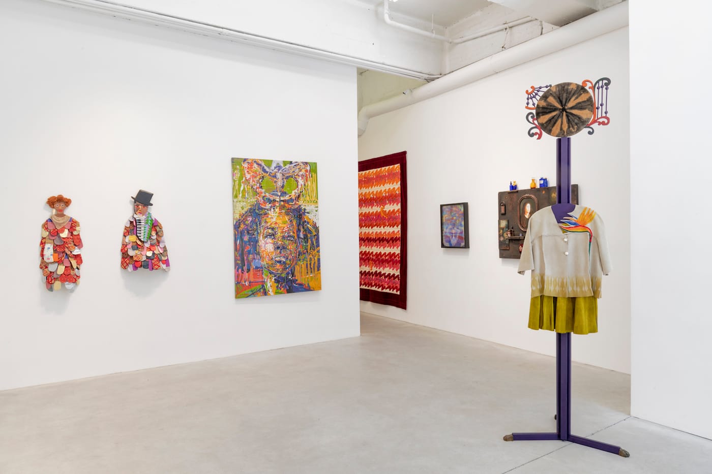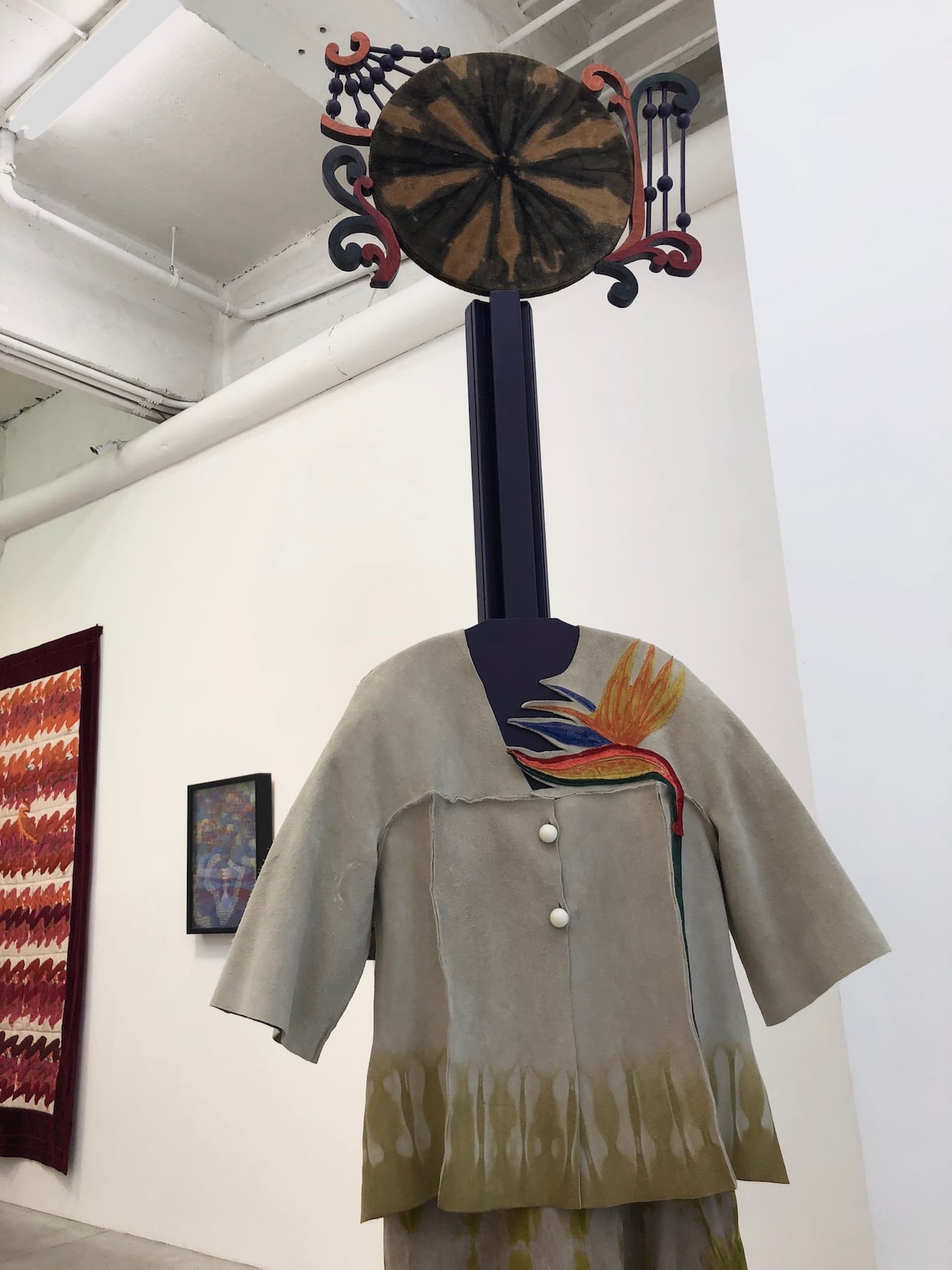 Walking into AfriCOBRA: Now, on view at Kravets Wehby gallery in Chelsea, you become a parishioner. Immediately upon entering the space, you are greeted by a sculptural being, a peculiar deity hybridizing tropes of African divinity and Southern Baptist Christianity. The seven-foot-tall figure, crafted by AfriCOBRA member and fashion designer Jae Jarrell, ushers you inside the gallery like a church lady welcoming an arriving congregation. Made of cowhide splits, the long-necked being is topped with a whimsical version of a church hat, or a halo. She wears a hand-sewn, two-piece skirted suit with a colorful bird-of-paradise embellishment, its suede naturally dyed in greenish hues, influenced by West African fabric dying technique. Southern religious sensibilities and West African spiritualities harmonize in the sculpture, blending different aesthetics of these traditions into one.