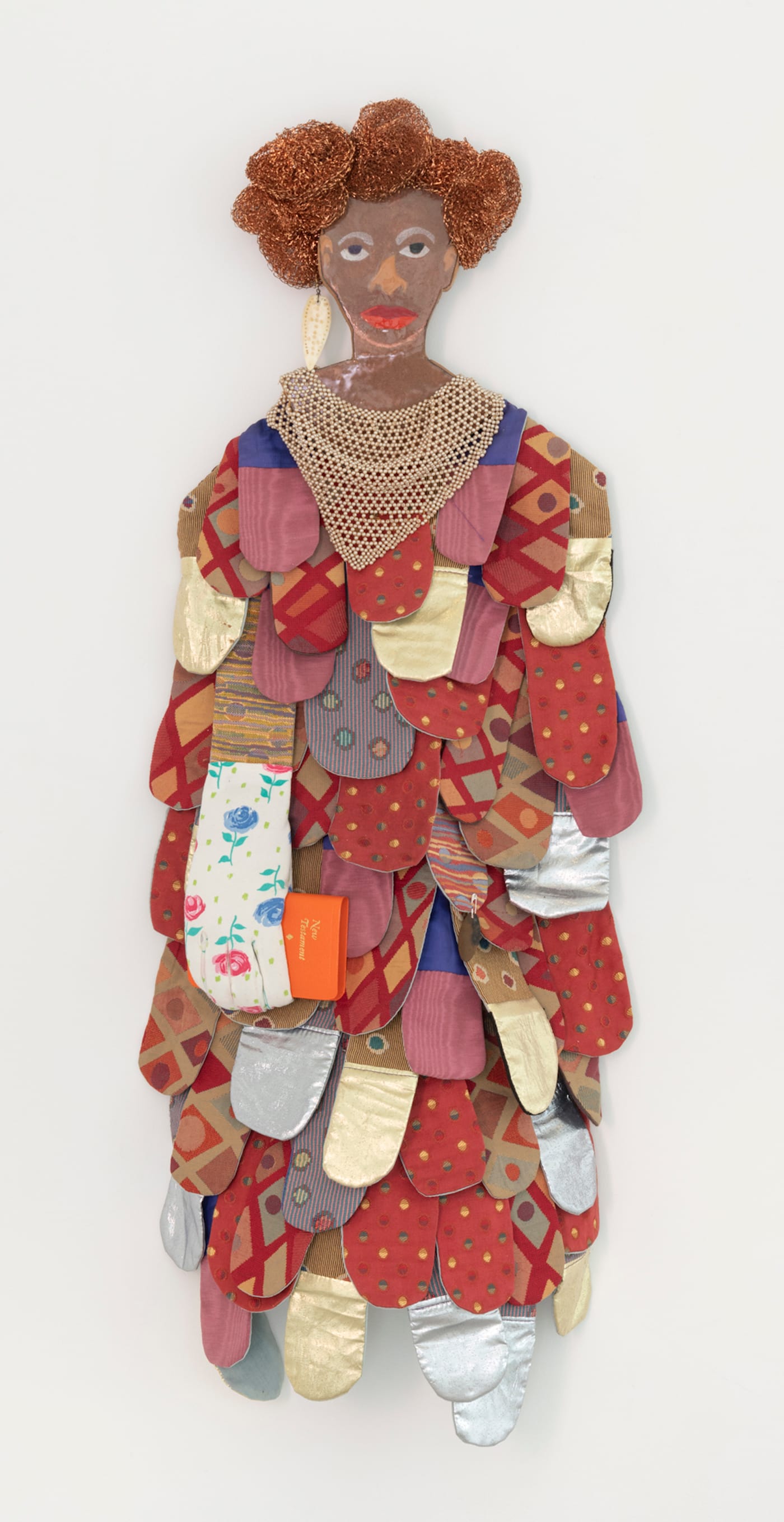 Behind our doorkeeper are two additional sculptural figures hanging on the wall, a man and woman, both dressed to the nines, one holding the New Testament. You have entered the fantastical, non-denominational, imagined church of Chicago-based artist collective, AfriCOBRA.