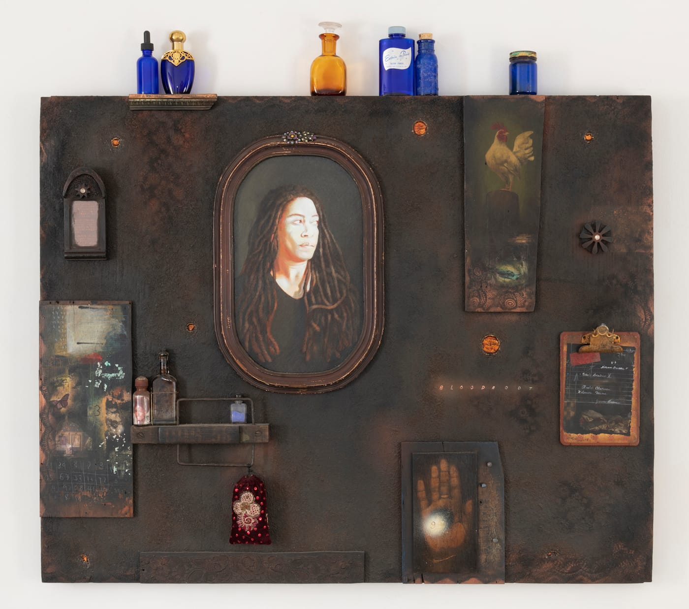 Renee Stout’s “The Black Wall” conjures folk magic in the gallery. A shrine to hoodoo, an African American folk tradition with roots in West African divination, the work features blue and amber glass vials and vintage photographs affixed to a blackened plywood panel. It calls to mind the haunting assemblage works of artist Betye Saar and adds to a broader exchange among Black women artists exploring Afrodiasporic alchemies.