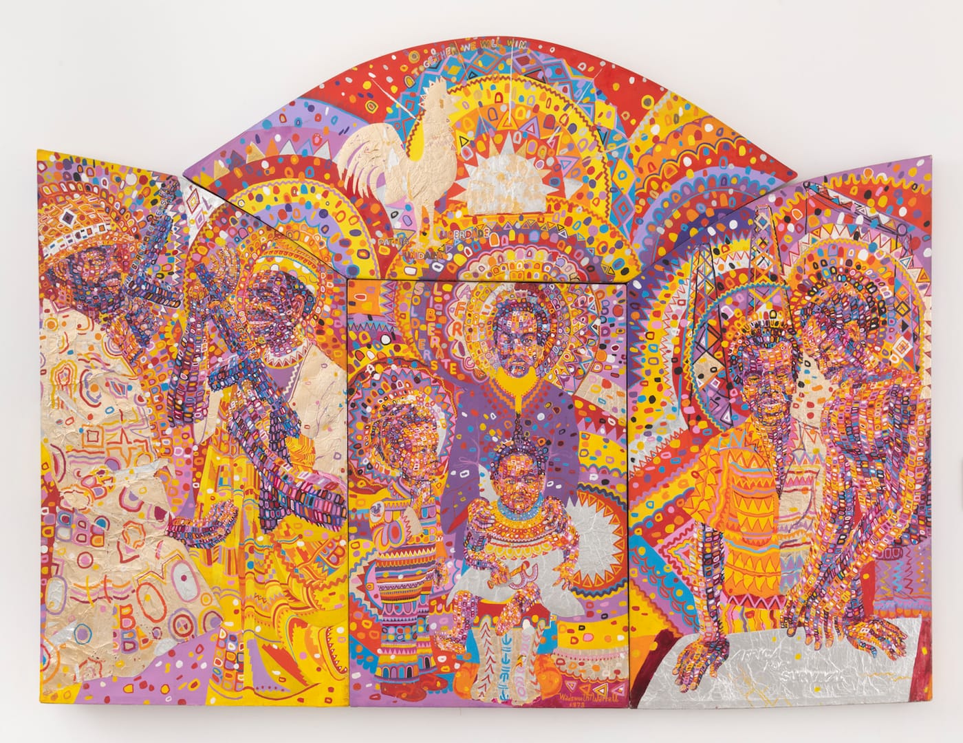 Wadsworth Jarrell’s “Together We Will Win” (1973) depicts Black folks as heavenly, haloed beings, painted in AfriCOBRA’s signature “cool-ade colors.” Faces, guns, and families recalling the Black Power movement are knit together with words, in both English and Spanish, only recognizable upon closer inspection of the busy triptych. Phrases like, “All Black Brothers Get Together” and “Africa For Survival” surround seven painted figures who appear to inhabit a spiritual plane, a realm where only Black folks working toward a revolution are welcome.