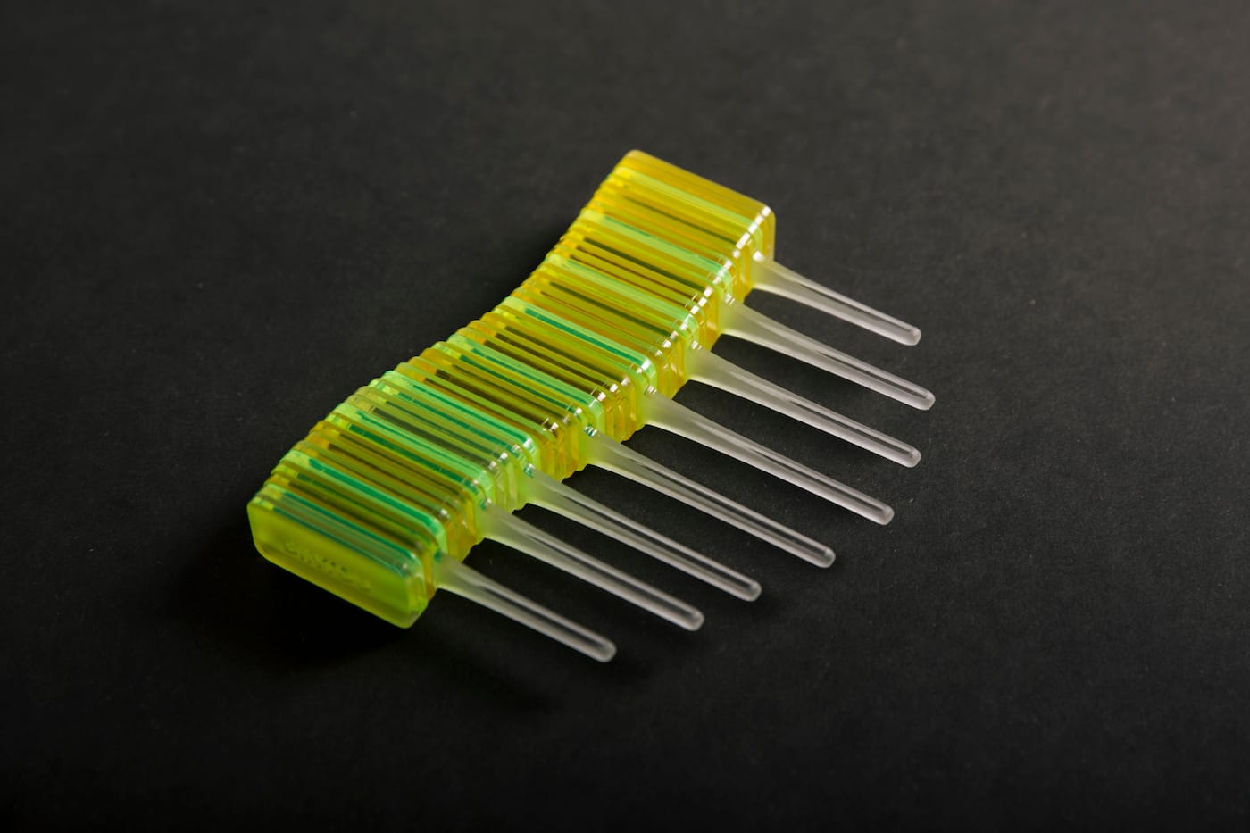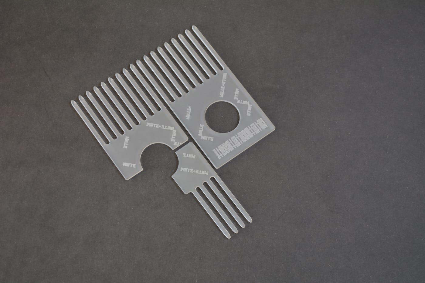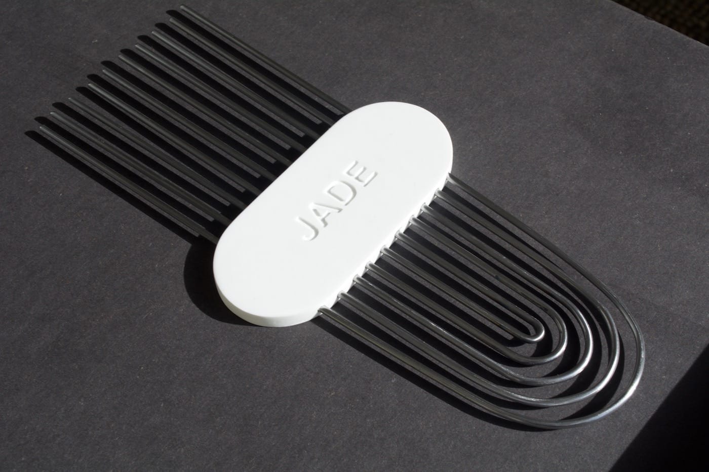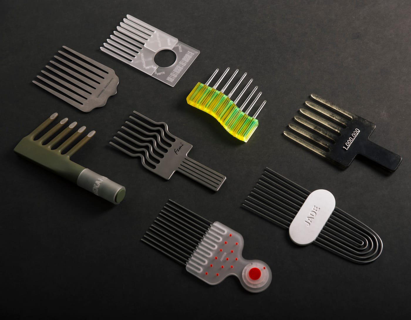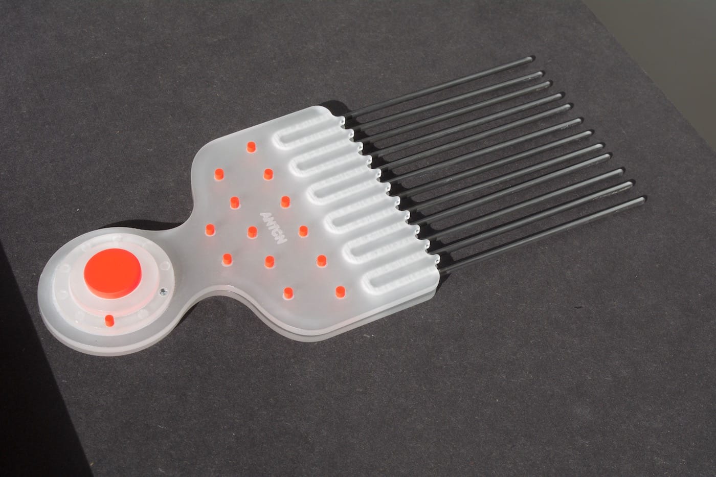 The comb represents Jacqueline’s mixed-race heritage. “She wanted a pink comb so I added a pink dot with a petrol surface in the handle,” Skinner said. “The shifting colors were something we both felt a deeper connection to in terms of identity.” He says the afro pick is designed with longer teeth to enable smoother motion through the hair.