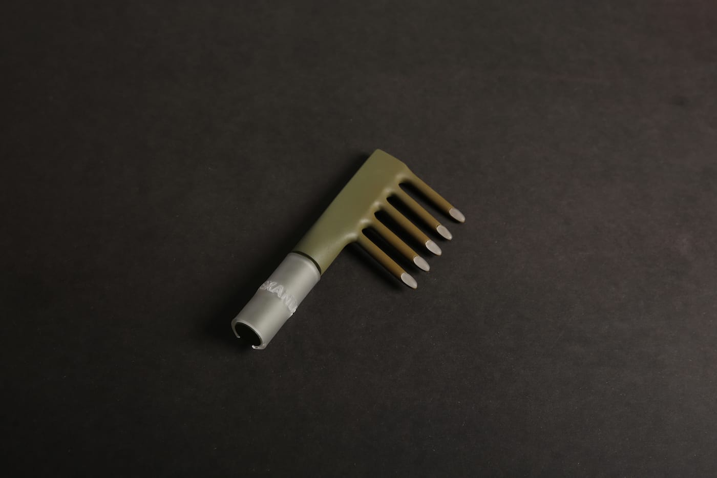 Even though afro hair is thick, it’s also fragile. Skinner chose to exaggerate his design based on Alexandra’s words, designing the pick to resemble a hand with five fingers and acrylic nails.