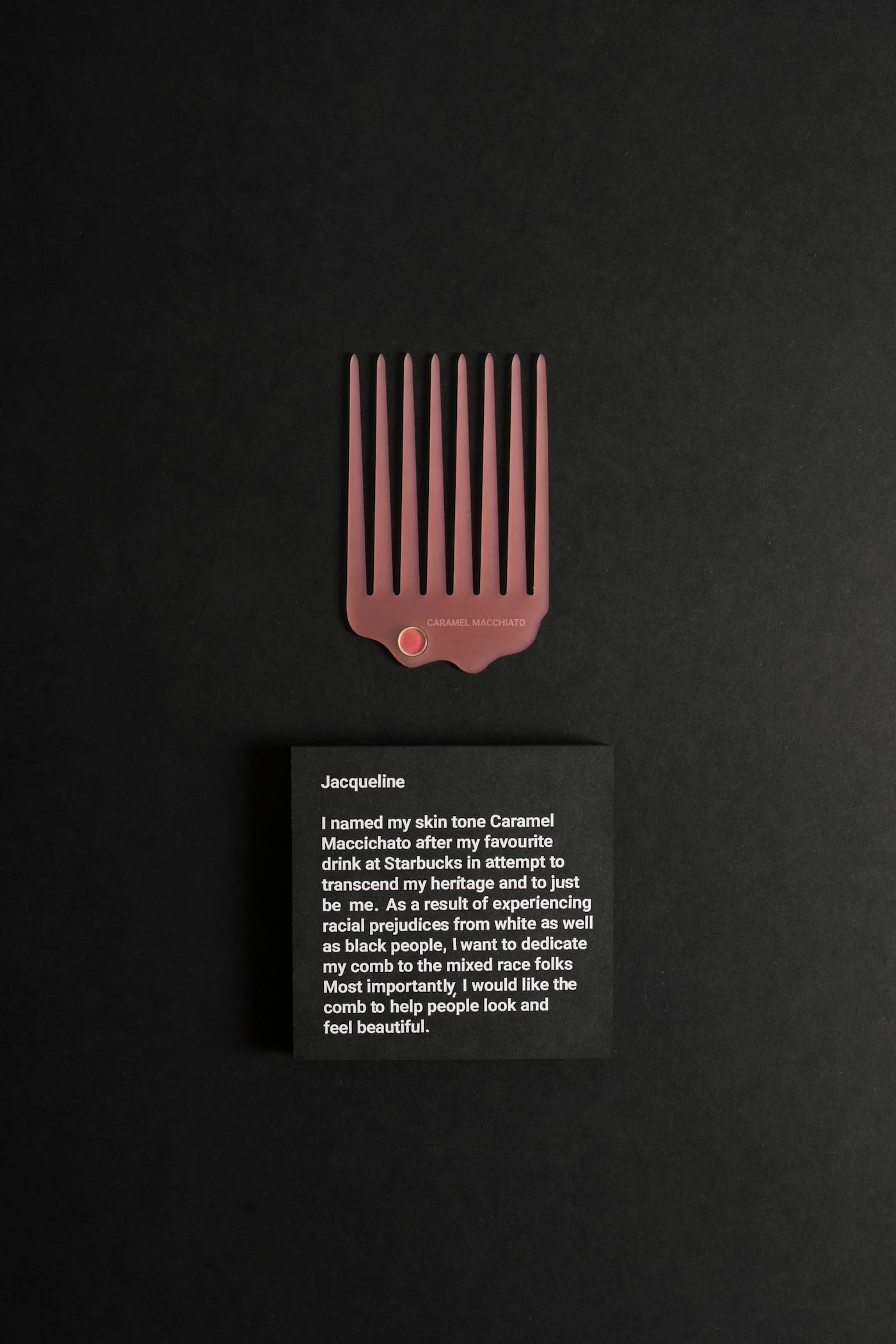 “I named my skin tone Caramel Macchiato after my favorite drink at Starbucks in an attempt to transcend my heritage and to just be me. As a result of experiencing racial prejudices from white as well as black people, I want to dedicate my comb to the mixed-race folks. Most importantly, I would like the comb to help people look and feel beautiful.”
