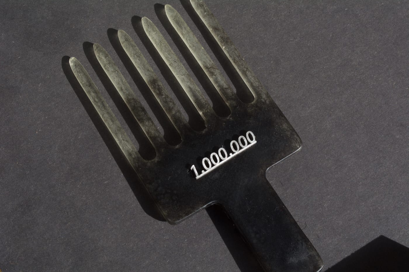 “Miliona is a term for a million,” the designer explained. “She told me that she was one in a million, so writing her name in numbers was a given when we realized that it also spoke for diversity among Black identities.” Skinner says that the afro pick is constructed partially from afro hair, preserving the strands as decorative elements in a statement on Black beauty.