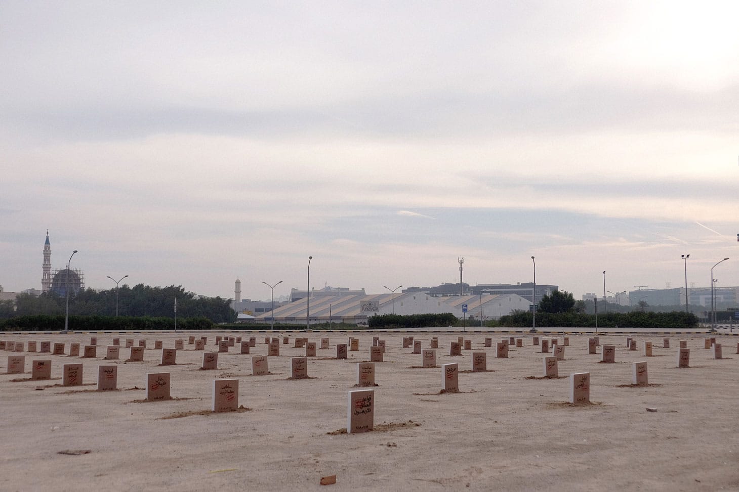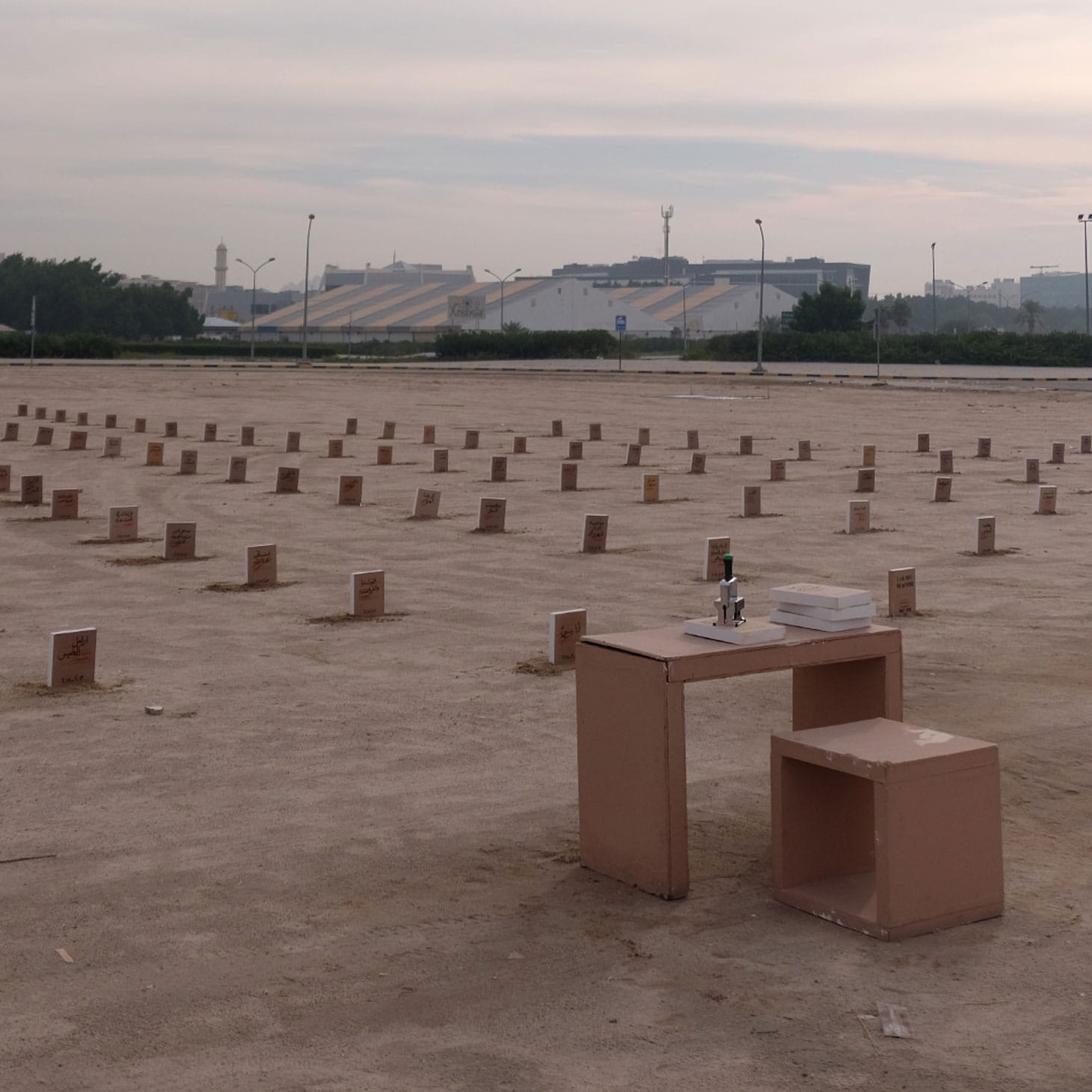 The Cemetery remained intact for four hours before it was removed by Kuwaiti authorities. Though he has not yet been approached by government officials, Sharaf tells Hyperallergic, “There is a chance that I might face legal repercussions because I did not take permission to use the land to put my installation.” He says the project was self-funded and in no way affiliated with the Annual Book Fair.