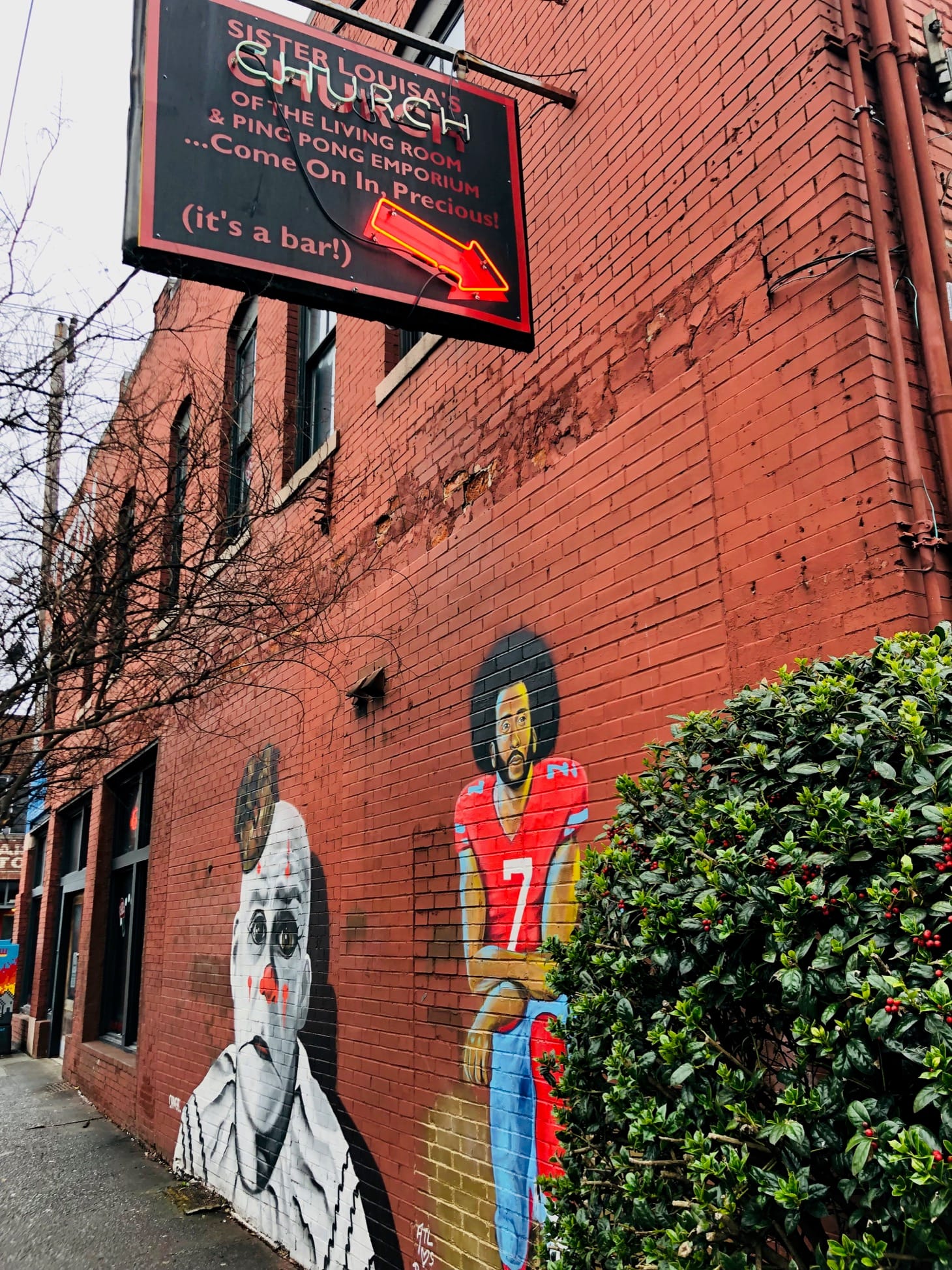 With the help of several artist friends, Williams peppered the city of Atlanta with more murals of Colin Kaepernick, right in time for the Super Bowl. Williams says the response has been very positive, and he has been featured on NPR, BBC, and other press outlets talking about this story. The community response as well has been very supportive of Williams. Many of the new Kaepernick murals were placed, with permission, on the walls of prominent local businesses. One of the locations, Sister Louisa’s Church of the Living Room & Ping Pong Emporium (a very popular local bar), has been the site of several iconic murals, including a recent portrait of black political figure Stacey Abrams.