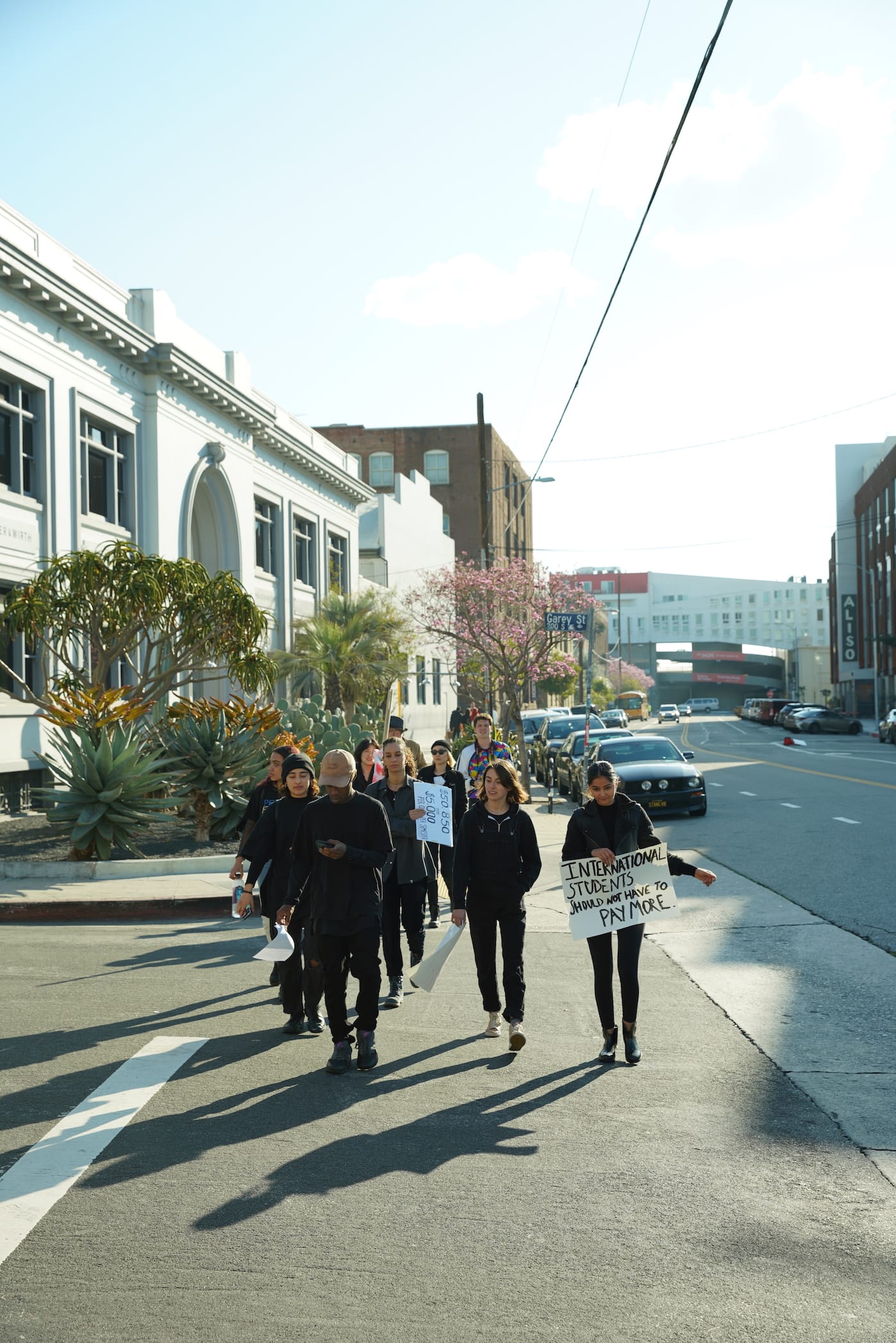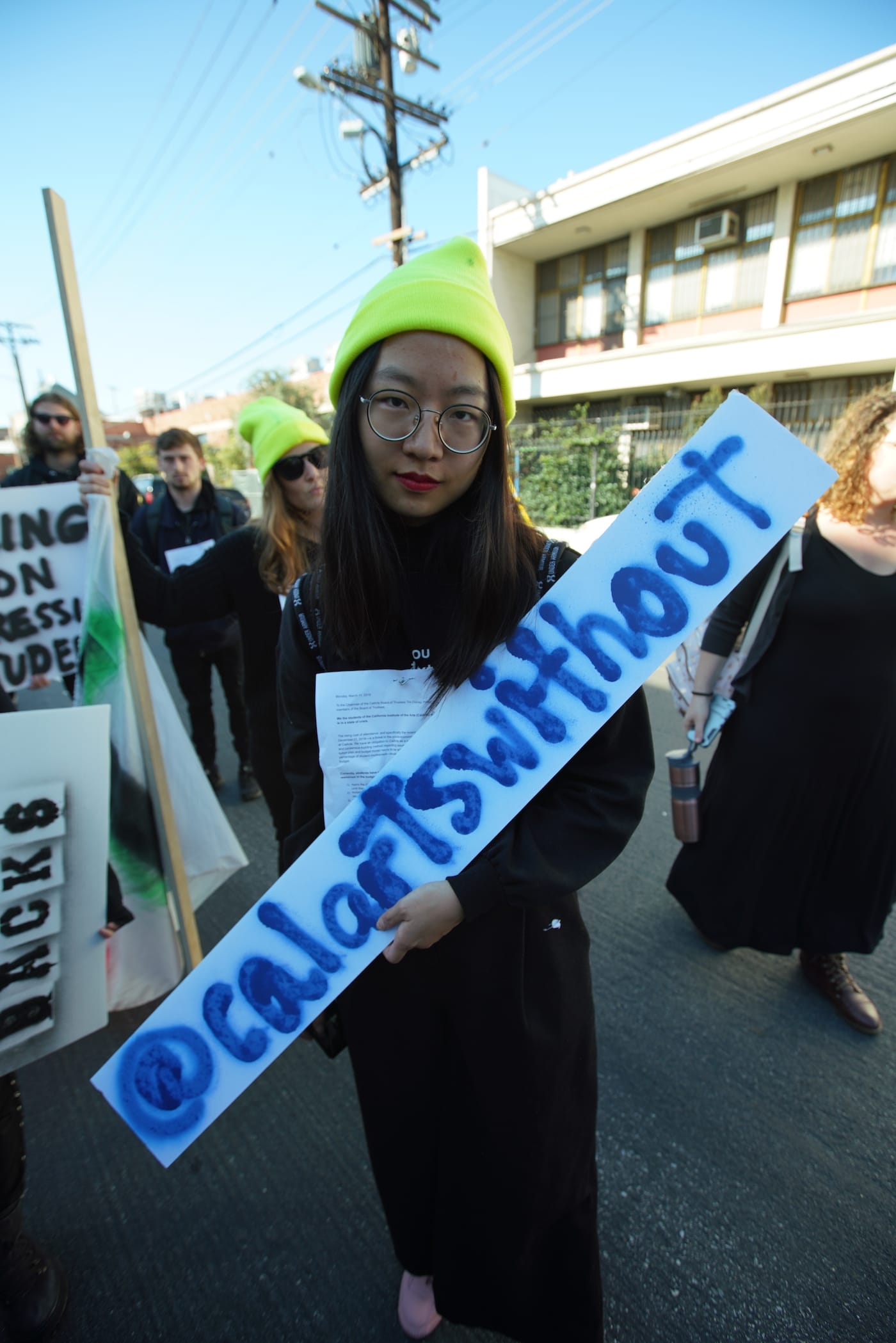 LOS ANGELES — On Tuesday morning, outside the gallery Hauser & Wirth, a group of protesters dressed in black silently stood with letters pinned to their chests. The students were from the California Institute of the Arts (CalArts), who bussed down from Valencia to deliver their letter to the CalArts Board of Directors and President Ravi S. Rajan, who were in the process of voting on the budget for the 2019–20 academic year behind the gallery’s doors. A recurring message, “you are nothing without us,” was flanked by a number: 50,850. That’s the tuition students will pay to attend the esteemed arts institution next year.
