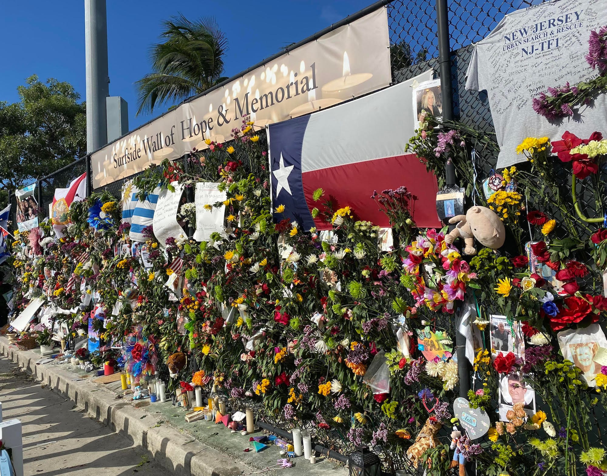 Flower garlands, flags, stuffed animals, a painted mural, and a pair of sneakers: these are just a few of the objects on the Surfside Wall of Hope, a temporary memorial to the victims of the Champlain Towers collapse on June 24. Rescue crews sifted through the building's rubble for weeks as the death toll climbed to 98; the remaining portion of the condo was eventually demolished and the site cleared. The Wall of Hope,erected by friends and relatives along the fence of the nearby Surfside Tennis Center, remained for two months after the tragedy, a deeply intimate contrast to the haunting emptiness of the site where the structure once stood.