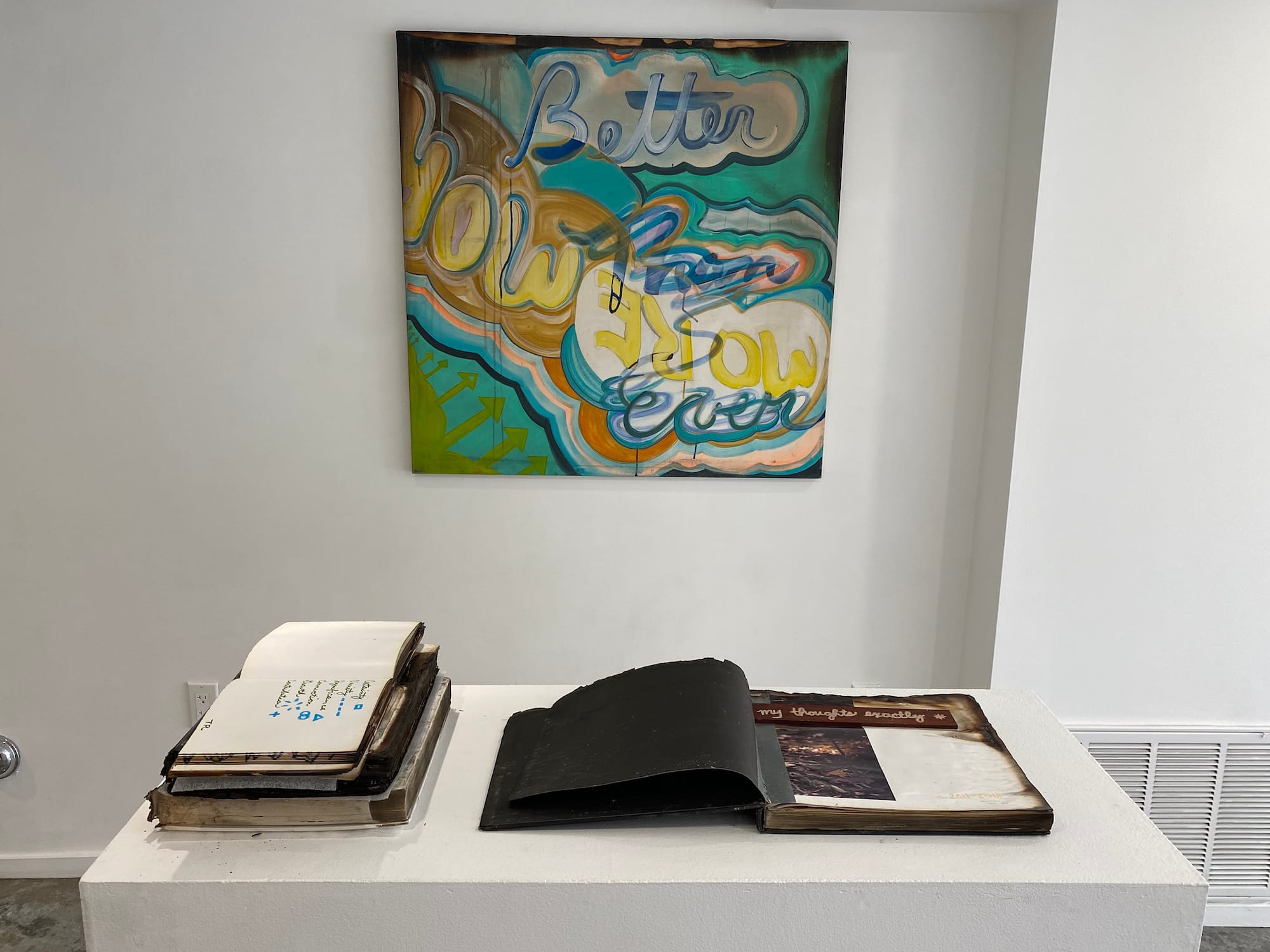 Francine’s tragedy is quite recent, but she is beginning to find meaning from the ashes. Her burned paintings and notebooks are included in the group exhibition Of Flames and Shadows Gone Astray, which recently opened at Bermudez Projects. The show features artists who use fire in their works to explore themes of loss, perseverance, and resilience, with Francine being the only participating artist whose work is not intentionally fire-damaged. The singed edges and burn marks lend an element of poignant irony to the text painting "Better Than Ever (MORE MORE)" (2018/2024), and two vertical canvases based on New York Lotto tickets with their themes of fortune and risk. In others, like "House on Fire" (2012/2024), the connection between the original subject matter and current condition is uncanny.