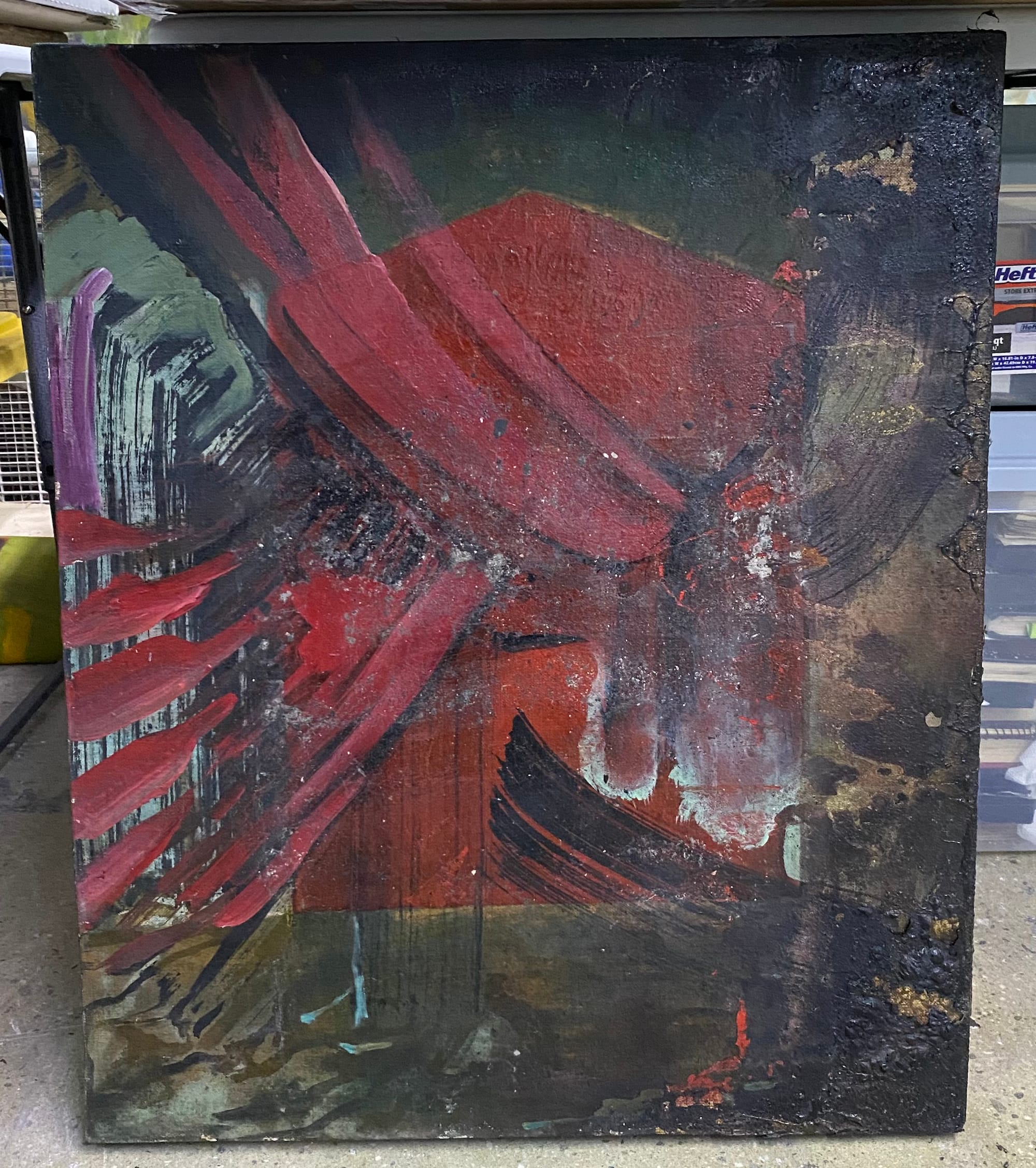 Friends and neighbors helped her rescue any unscathed artwork, laying it out in the driveway to dry after being doused by firehoses and recent rain storms before packing it up and hauling most of it off to a storage facility. She was able to secure a space in a studio building in Northeast LA, where she brought the few intact and salvageable paintings; however, she says other artists in the complex have complained of the lingering smell of smoke.
