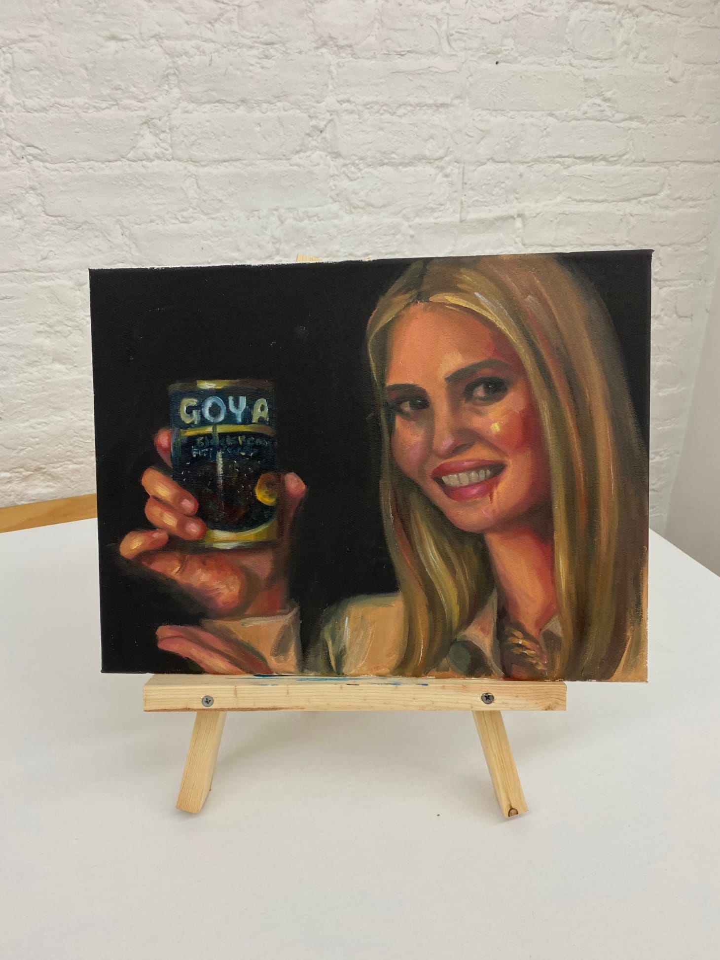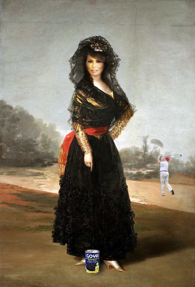 As outraged citizens cited the Trump administration’s cruel family separation policy, openly racist remarks, and harsh immigration policies as incongruent with Goya’s marketing to the Latinx community, the president’s daughter, Ivanka Trump, fanned the flames by posing with a can of Goya beans. The bizarre portrait has become a symbol of this dystopian political moment, and artists were quick to appropriate the image in hilarious and dark ways.