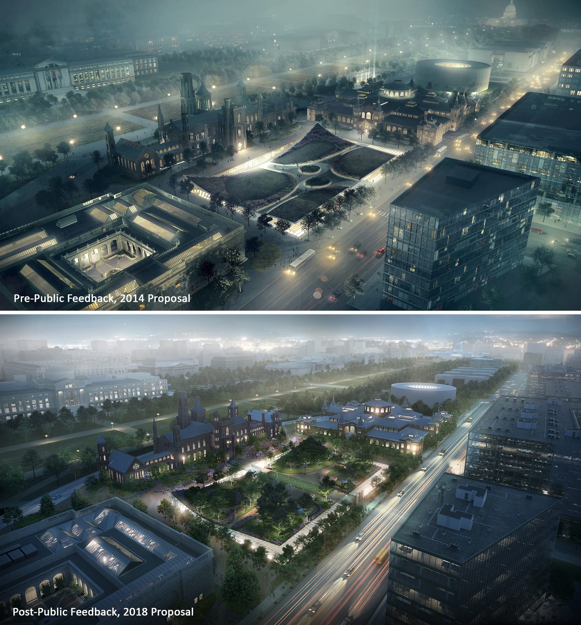 BIG and the museum seem to have listened. Last week, BIG shared its updated design for the Smithsonian, which saves the beloved garden space and leaves the Haupt Garden largely untouched in the middle of the new landscaping between the museums.