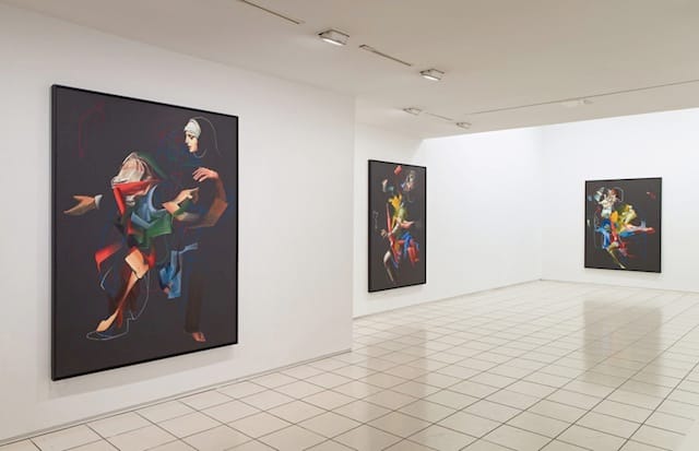 There are other ways to read these paintings, which is what elevates them into another realm. Schoolwerth’s breaking down of the bodies in the original painting as well as his reconfiguring them into a series of detached body parts recall the first series of “Woman” paintings that Willem de Kooning did in the 1940s. I am thinking of Seated Woman (c. 1940) and Pink Angels(c. 1945). Schoolwerth is trying to synthesize his predecessors — among them, in addition to Kooning, I would include Arshile Gorky and Francis Bacon — without making work that cites them. Schoolwerth isn’t interested in either parody or irony, which is one of the accepted modes of postmodernist art, particularly when it comes to painting.
