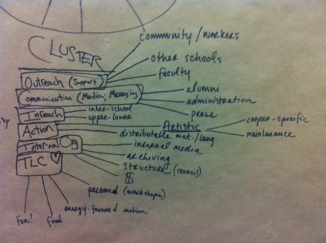 That new structure is called a spokescouncil, diagrammed in the picture above. Gollan said it was a new idea for him and the other occupiers, but they’re excited about it. “Cooper has a lot of people with different opinions, so it’s been hard to get people excited and organized. So a spokescouncil breaks people down into a structure where people can work on stuff. This all happened in the last week, and now we’ll be coming down and plugging into this.”