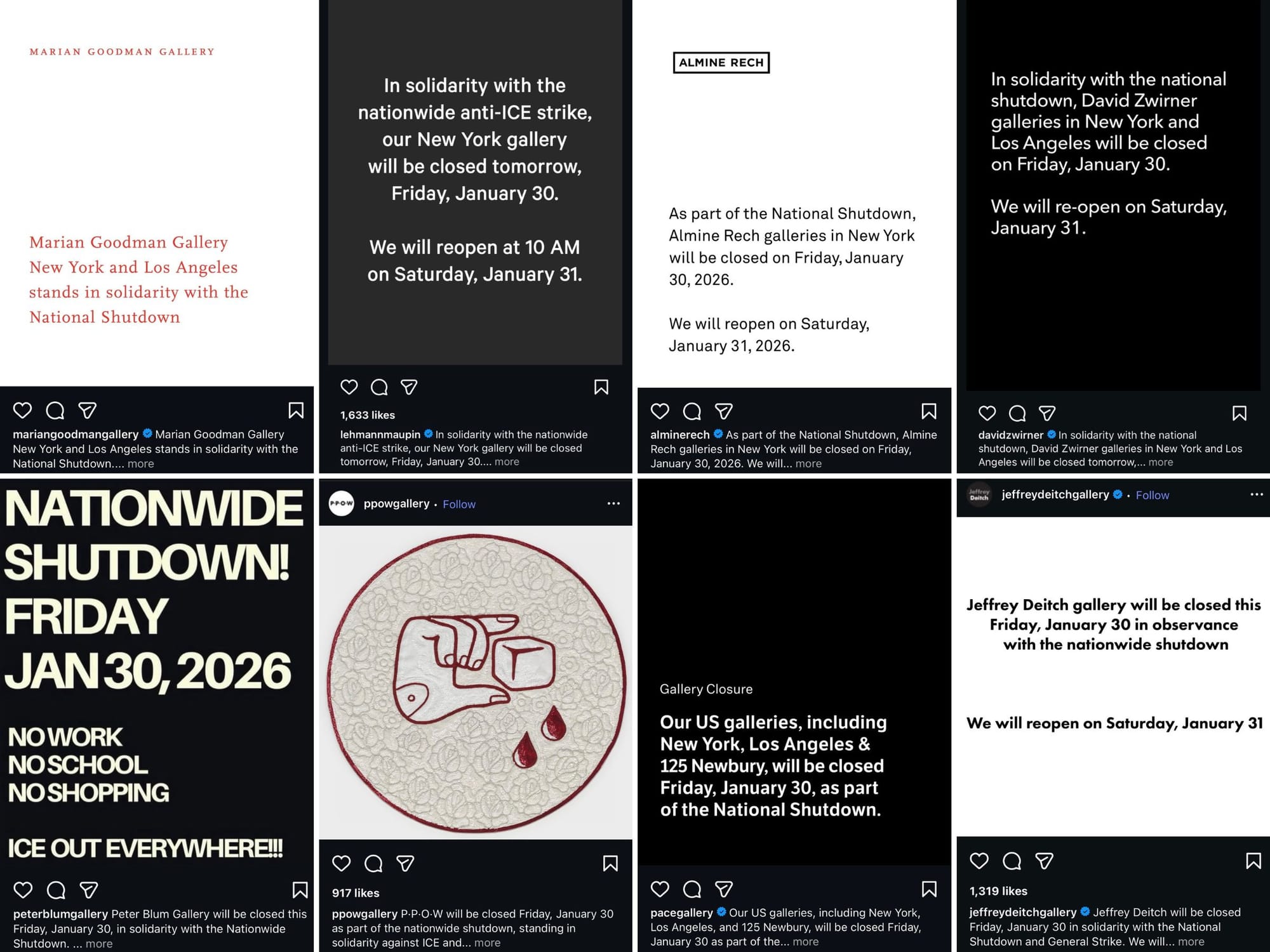 Over the last few days, my feed has filled up with galleries posting statements about standing in solidarity with protests against Immigration and Customs Enforcement (ICE). Black text on white backgrounds. Thoughtful fonts. Promises to “hold space” and “support our communities.”