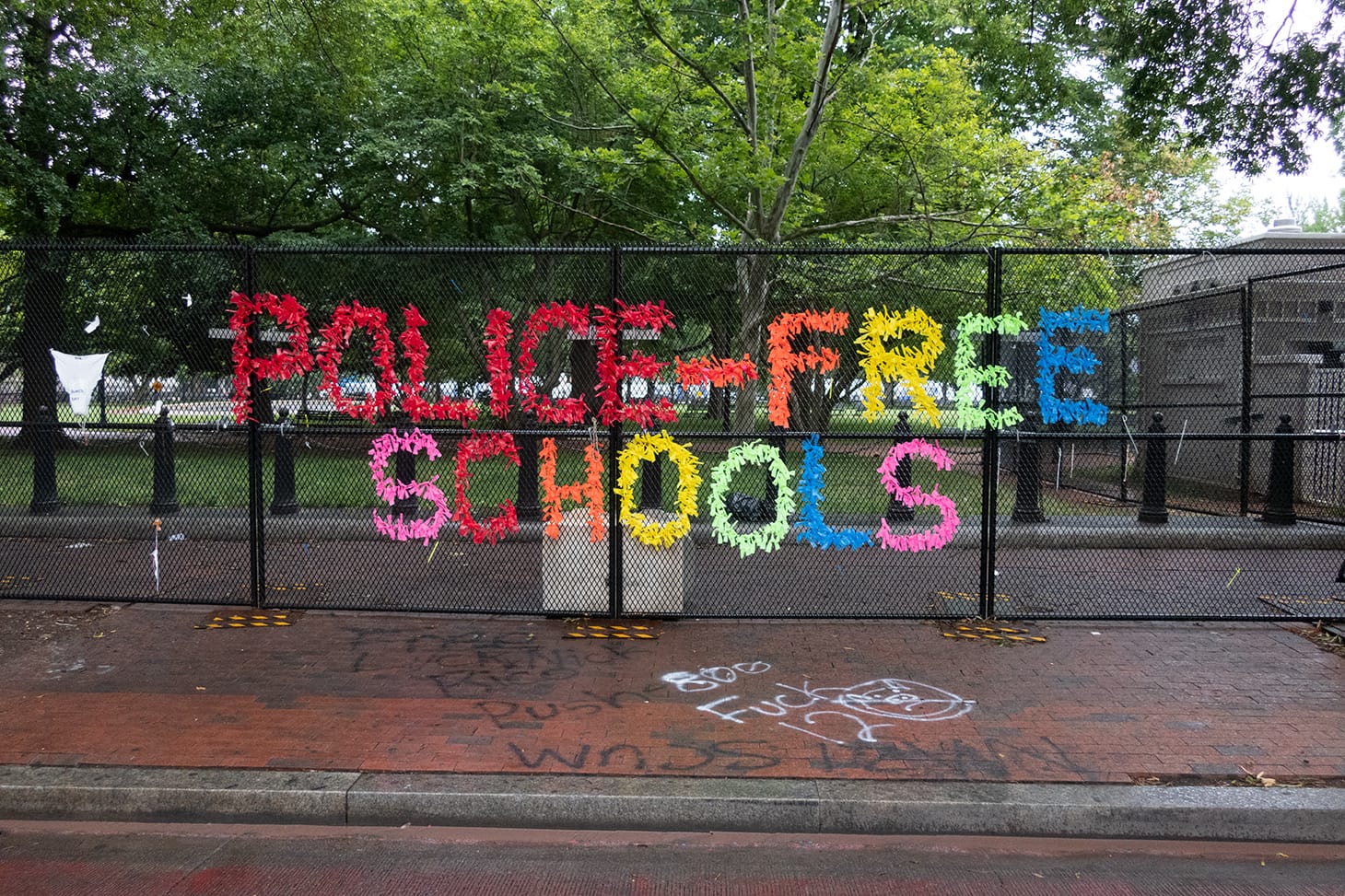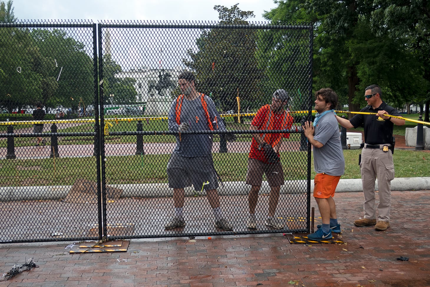 Afterward, Black Lives Matter protestors transformed the fence into a messaging board and a spontaneous art show. When the activists discovered that certain sections of the fence had been removed and that it would soon be dismantled, they took what they could and reinstalled it across the street. Believing the memorabilia could be trashed by the contractors, they reinstated it on scaffolding on the other side of Lafayette Square.