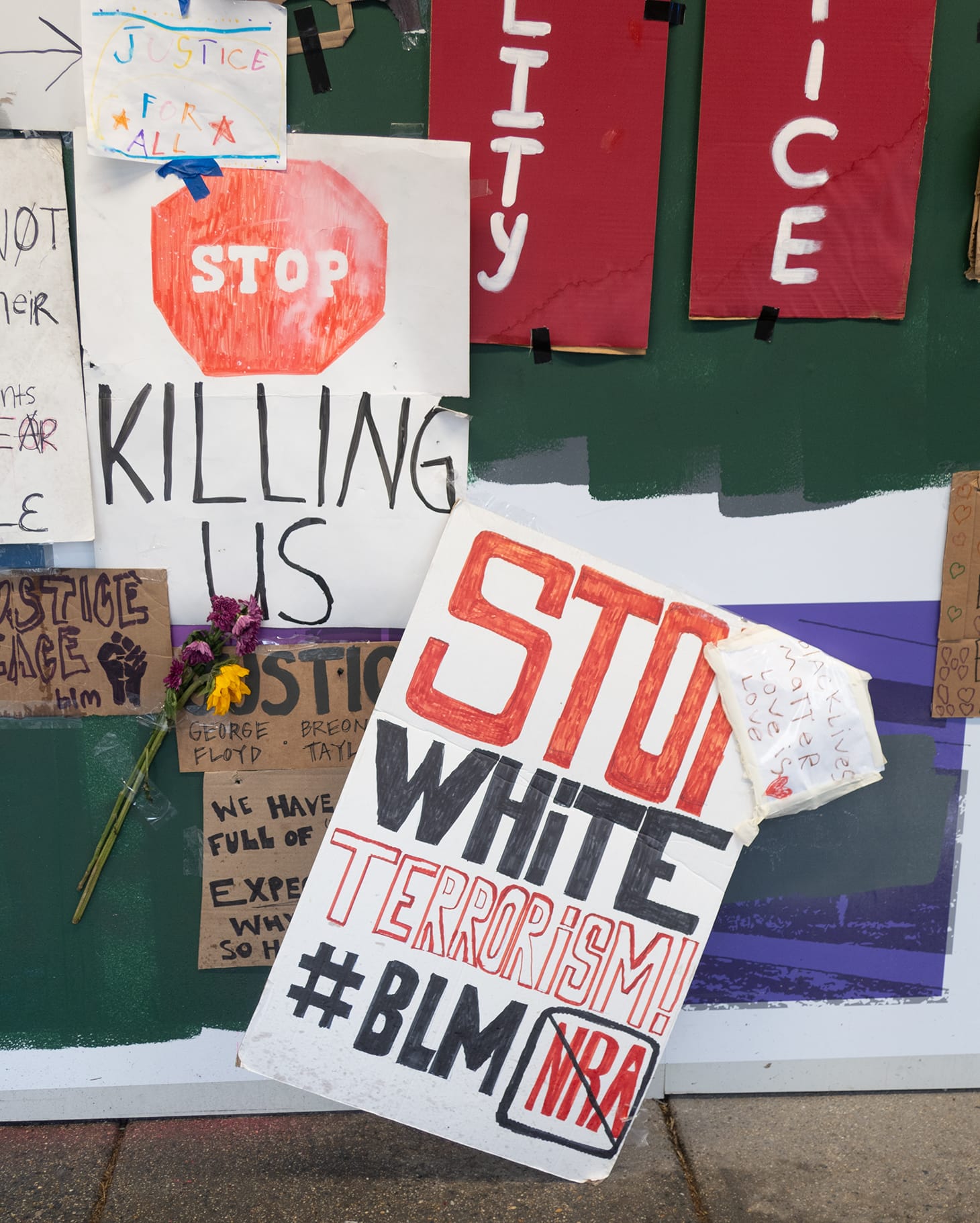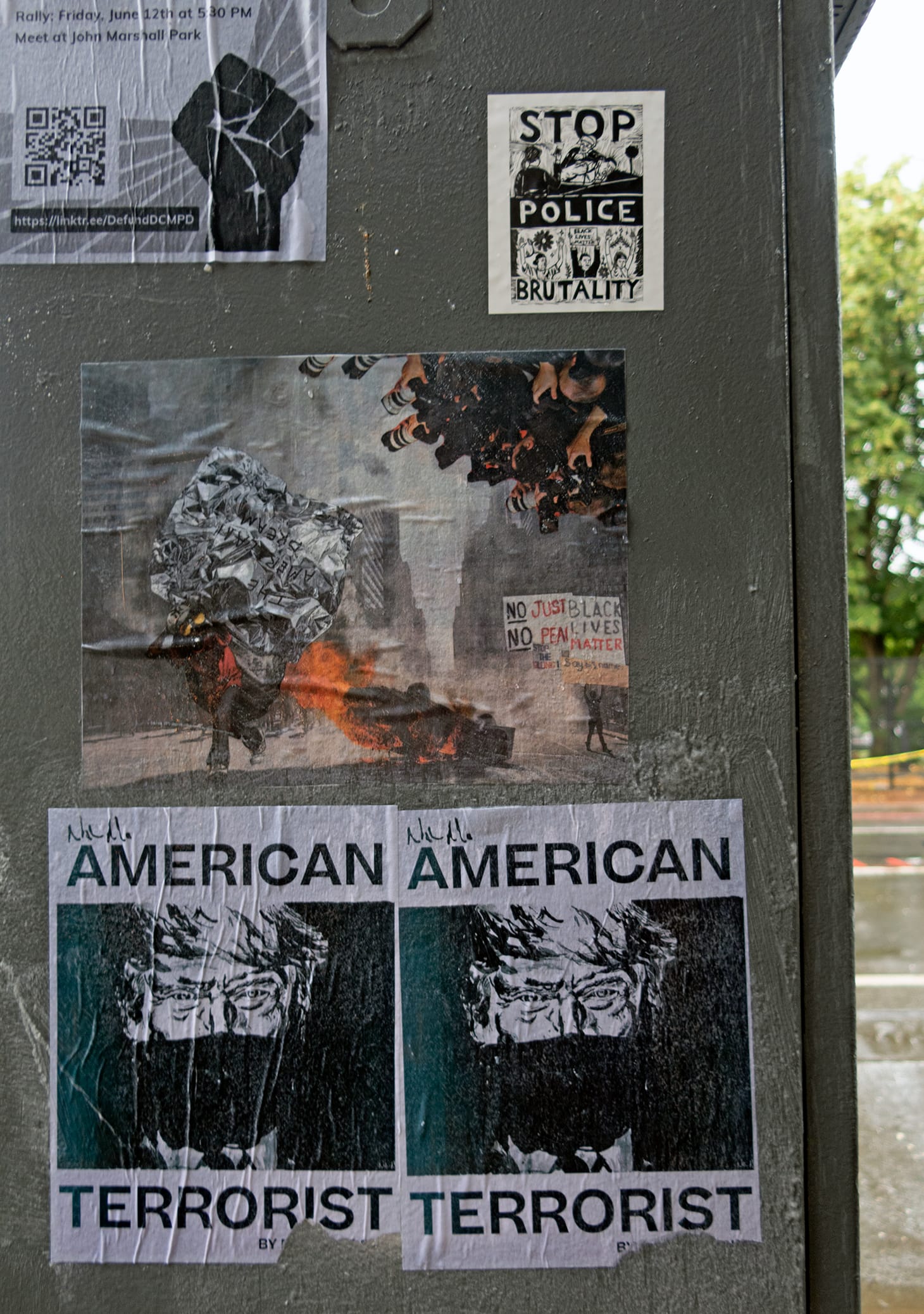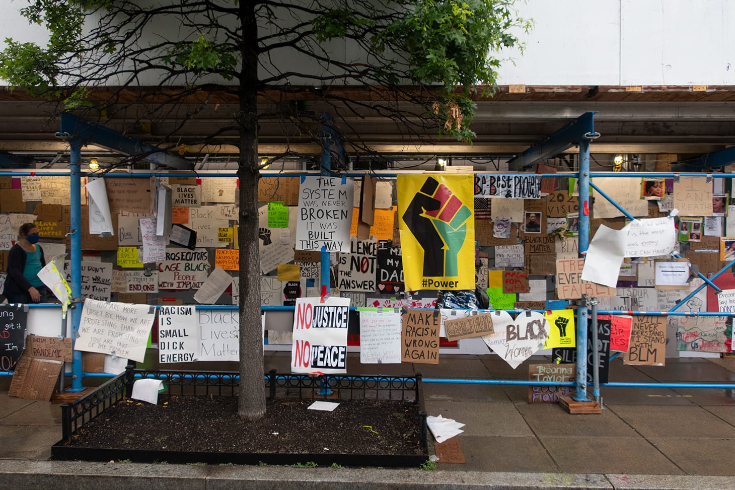 When I visited the public artwork, an aspiring graffiti artist and activist named Noah explained to me that he was among those who helped and two of his own signs were hanging among them. He is one of many contributors to the still-growing display, as people continue to bring new signage and posters and hand it at the site. Trees, poles, and electric boxes, as well as the plywood used for boarding up storefronts on 16th Street, are being utilized to post words and graphics in support of the Black Lives Matter.