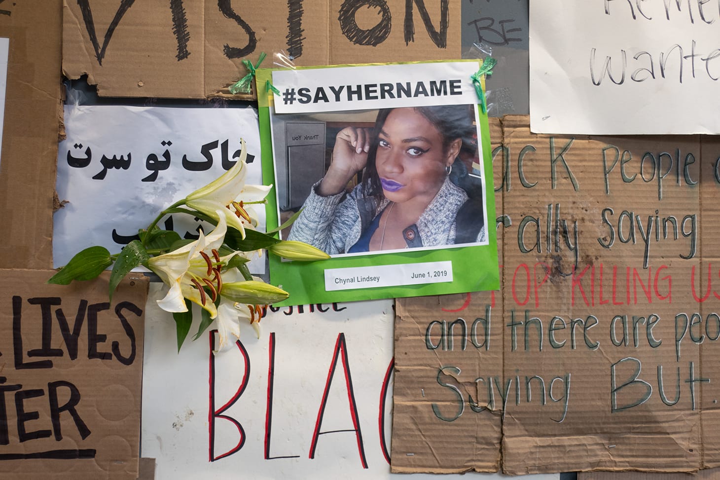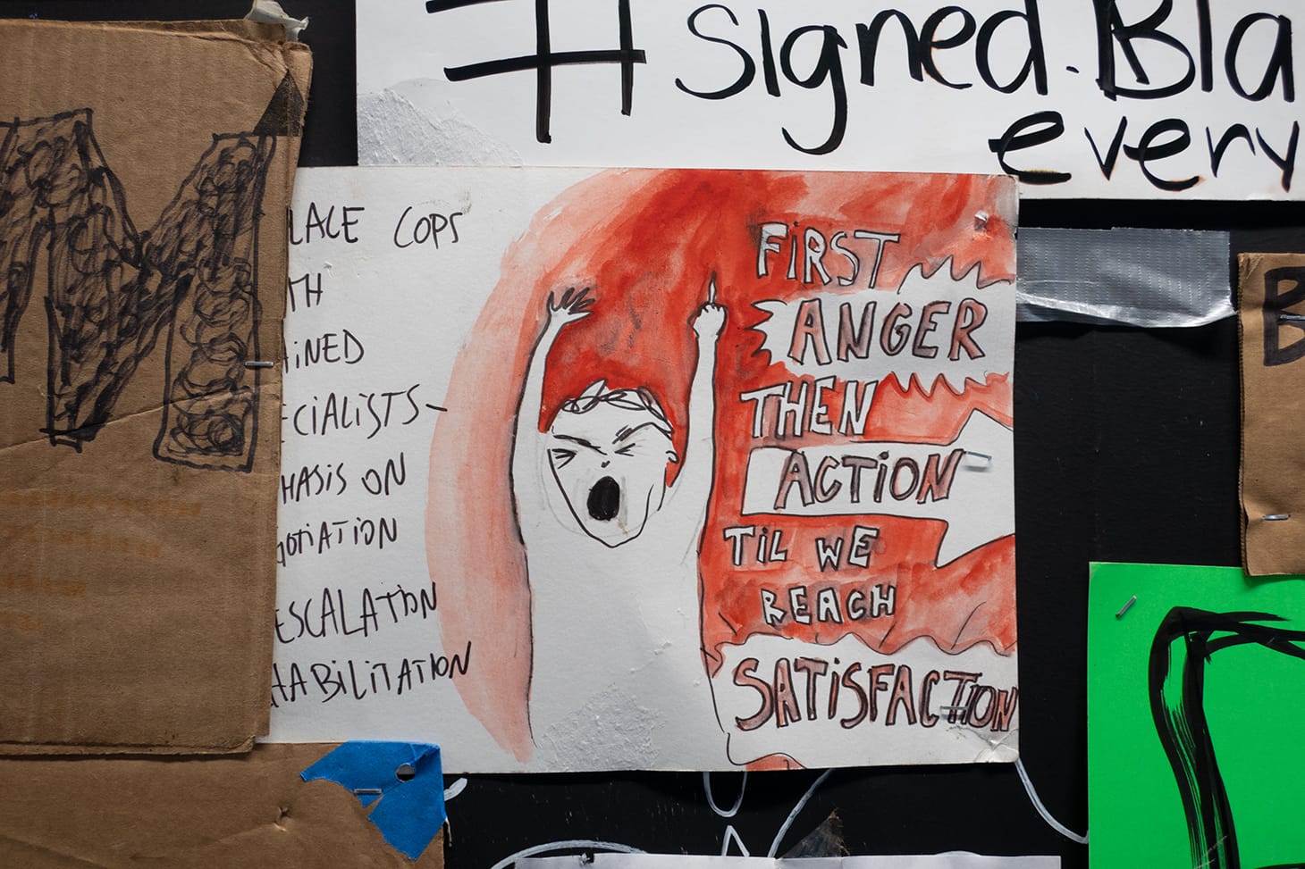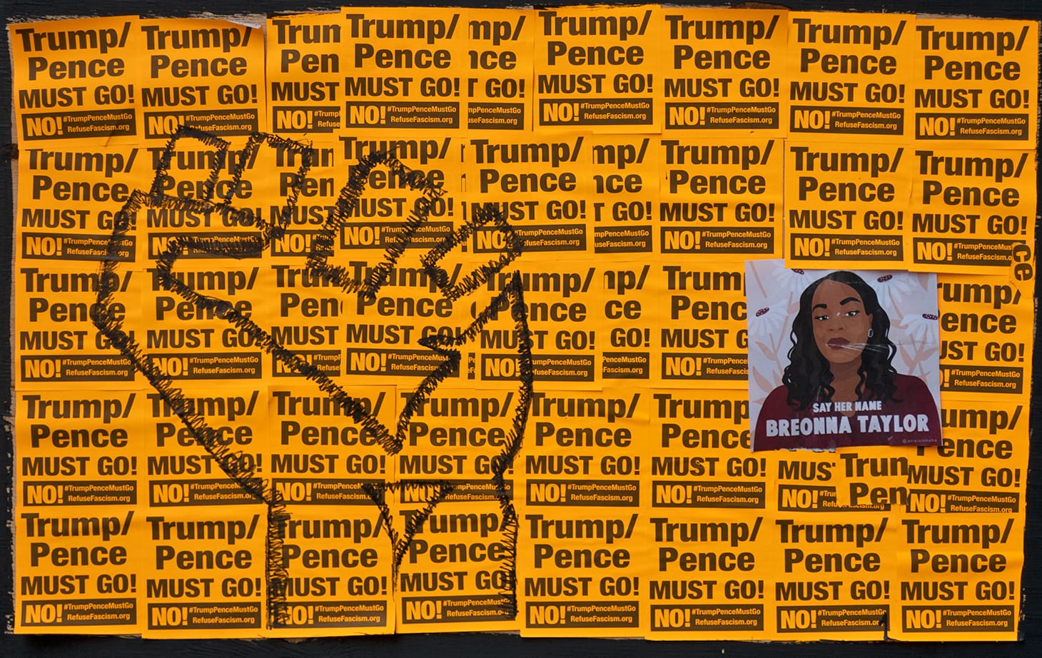 When I visited the public artwork, an aspiring graffiti artist and activist named Noah explained to me that he was among those who helped and two of his own signs were hanging among them. He is one of many contributors to the still-growing display, as people continue to bring new signage and posters and hand it at the site. Trees, poles, and electric boxes, as well as the plywood used for boarding up storefronts on 16th Street, are being utilized to post words and graphics in support of the Black Lives Matter.