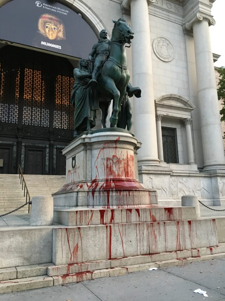 The recent protests against the monument go back to October of 2016 when the group Decolonize This Place organized the first Anti-Columbus Day tour inside the museum with the participation of other social justice movements. As a symbolic gesture, the protesters shrouded the statue with a parachute. A year later, members of the group Monument Removal Brigade (MRB) escalated the fight against the monument when they splashed the sculpture’s base with blood-red paint. In an interview with Hyperallergic, the group described the action as a “counter-monumental gesture that does symbolic damage to the values [the statue] represents: genocide, dispossession, displacement, enslavement, and state terror.”