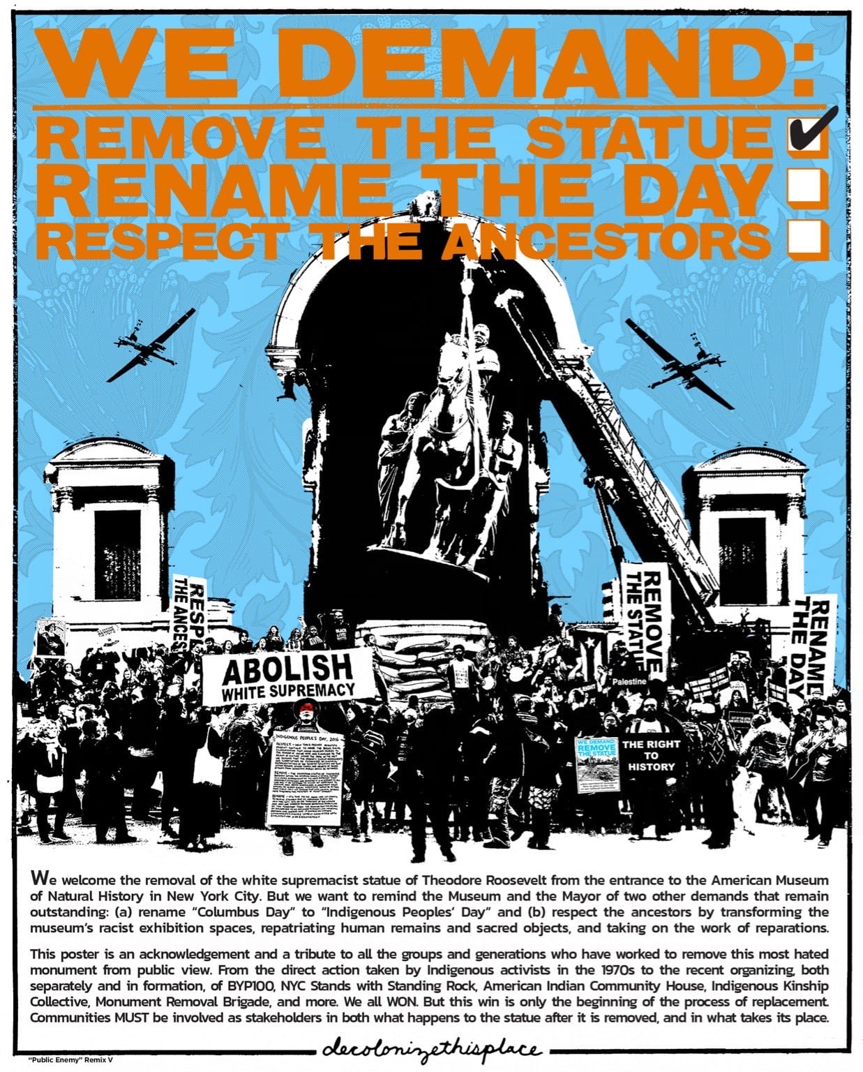 The group released a poster that shows the Roosevelt statue being removed with a crane in front of a crowd of protesters. The poster is a tribute “to all the groups and generations who have worked to remove this most hated monument from public view,” the group said.