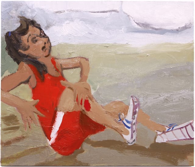 In the oil painting, “Hurt (red yellow blue)” (2014), the artist uses a loaded brush to quickly lay down the paint. A young woman is seated awkwardly on the ground, holding her knee, which is bleeding. Dressed in a yellow jersey and blue shorts — a school gym uniform — she looks pained, bewildered and determined. One detail that grabbed my attention about this painting — which I soon discovered was true of a number of others in the exhibition — is that the young woman’s sneakers are too big. Corrigan’s subjects are girls who are competing in sports. The oversized sneakers invite all kinds of symbolic readings — from what some believe is the unseemliness of women in sports to the inequality of prize money at the top professional levels, such as in tennis.