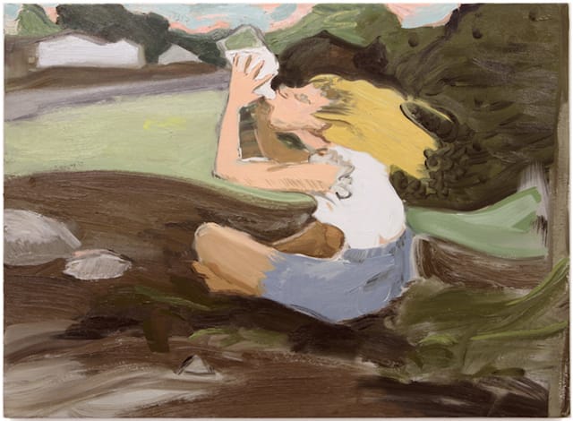 It seems to me that Corrigan, who had her first solo show at White Columns (October 27–December 15, 2012), is establishing a territory to further explore. Her use of humor is unlike anyone else’s. She isn’t interested in either slapstick or black humor, anything obvious. The young women clutching their bloody knees elicit our compassion, while the narratives they evoke are fragments with no obvious closure. The sinuous brushstrokes are simultaneously paint and rolling clouds, hills and grass. Everything is fleeting, conveying a world in constant turmoil. Corrigan’s adolescents are also undergoing change. They feel a bit out of sync with the rest of the world.