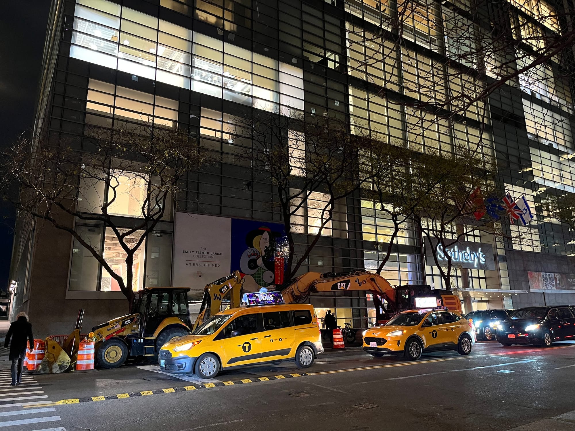 Art world denizens who descended upon Sotheby’s New York salesroom last night, November 8, weren’t disappointed to ogle a handful of Jasper Johns, Mark Rothkos, and Ed Ruschas sold off for a collective $400 million. But first, they had to skip past two grime-encased Caterpillar excavators parked directly outside Sotheby’s York Avenue entrance.