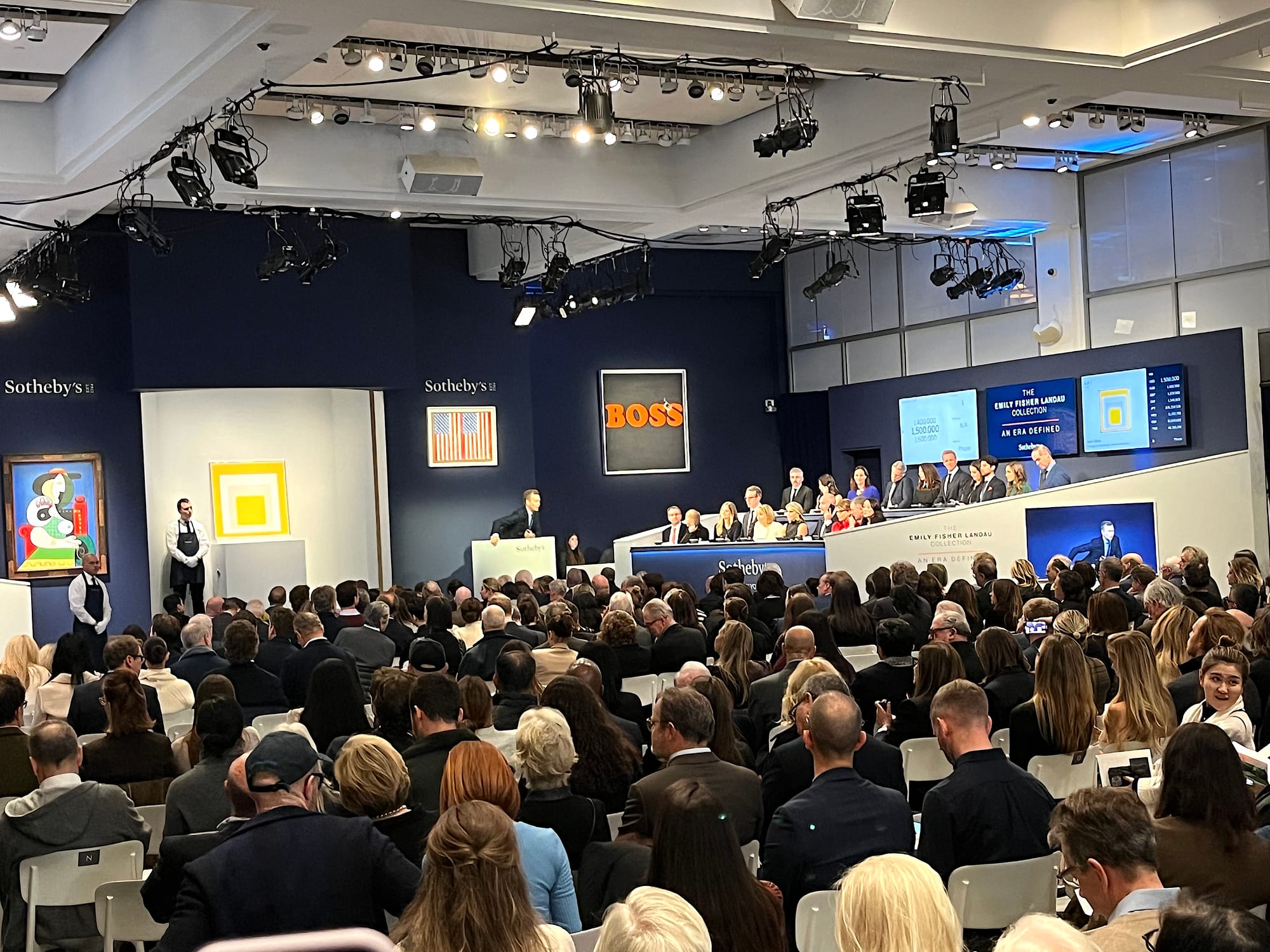 Guests shuffled into the main auction room where four of Landau’s most coveted paintings were already displayed on a wall behind the stage — Ed Ruscha’s "Securing the Last Letter (Boss")" (1964), Mark Tansey’s "Triumph Over Mastery II" (1987), Jasper Johns’s "Flags" (1986), and a 1932 Picasso, “Femme a la Montre,” that Landau hung above the mantlepiece of her Park Avenue home. Sotheby’s believed it would fetch more than $120 million. The rest of the works would be revealed one by one in an alcove behind the stage that moved like a lazy Susan as about 40 anxious-looking Sotheby’s employees seated on tiered risers took calls from wealthy clients with their prospective bids.