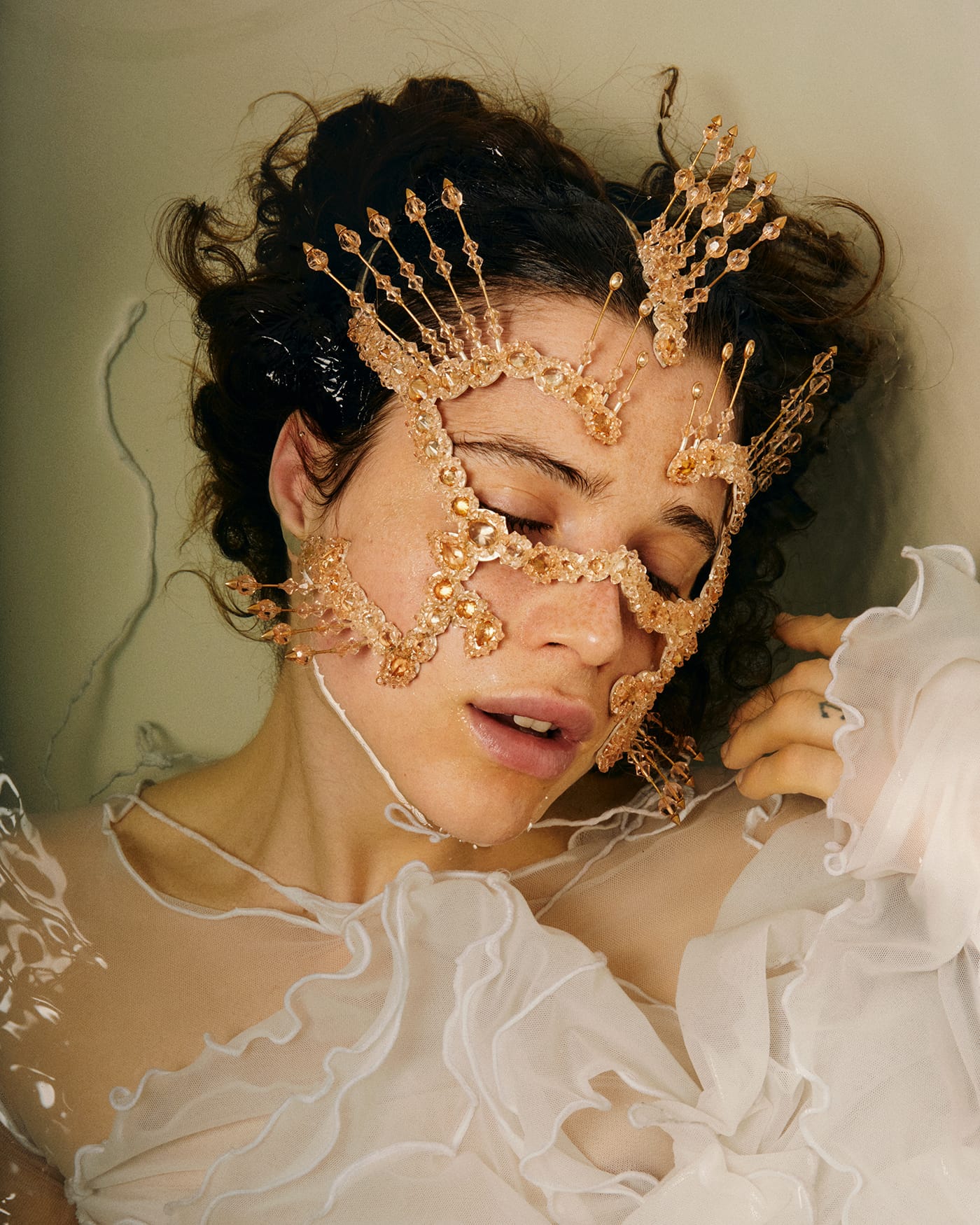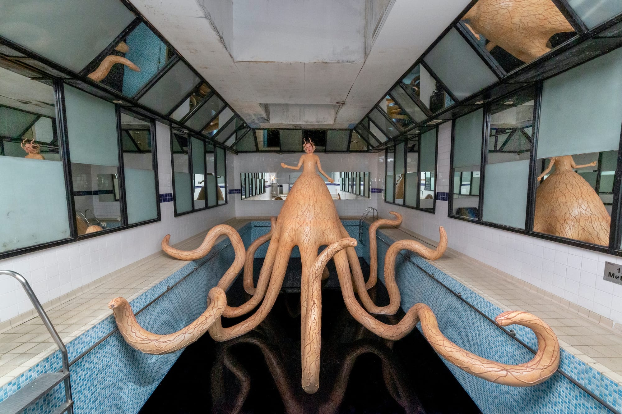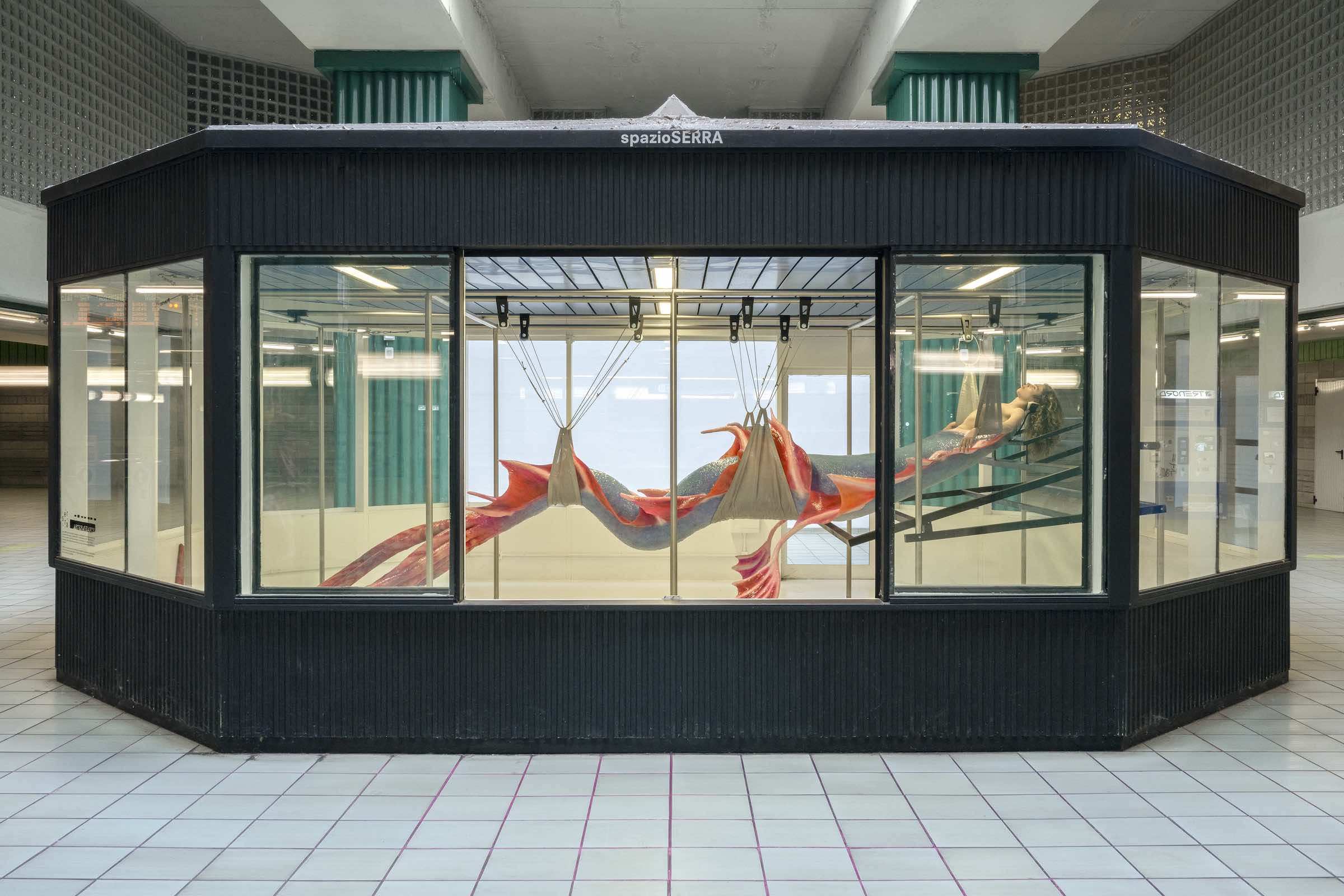 We're kicking off the last week of Pride Month with a conversation with Agnes Questionmark, a performance and installation artist from Italy now based in Brooklyn. Questionmark, a trans woman who also identifies as interspecies, often uses her practice to interrogate the perceived differences between humans, animals, robots, and aliens. Earlier this year, the artist embarked on one of her most ambitious projects to date: She spent 16 12-hour days suspended in a constructed greenhouse in Milan's Lancetti train station. Questionmark wore a sculptural tail for the site-specific installation, titled "CHM13hTERT" (2023), to create the appearance of a nearly 23-foot-long "non-definable alien-marine creature." The artist rested on a surgical bed she modeled after images of operating tables for horses and sea lions. This medicalized element, Questionmark says, speaks to a larger theme in her work: the ways in which people treat non-humans differently. Ultimately, the artist said she wanted "CHM13hTERT" to provoke questions: Was the figure viewers saw a human or animal, a man or woman, a sculpture or a real person?