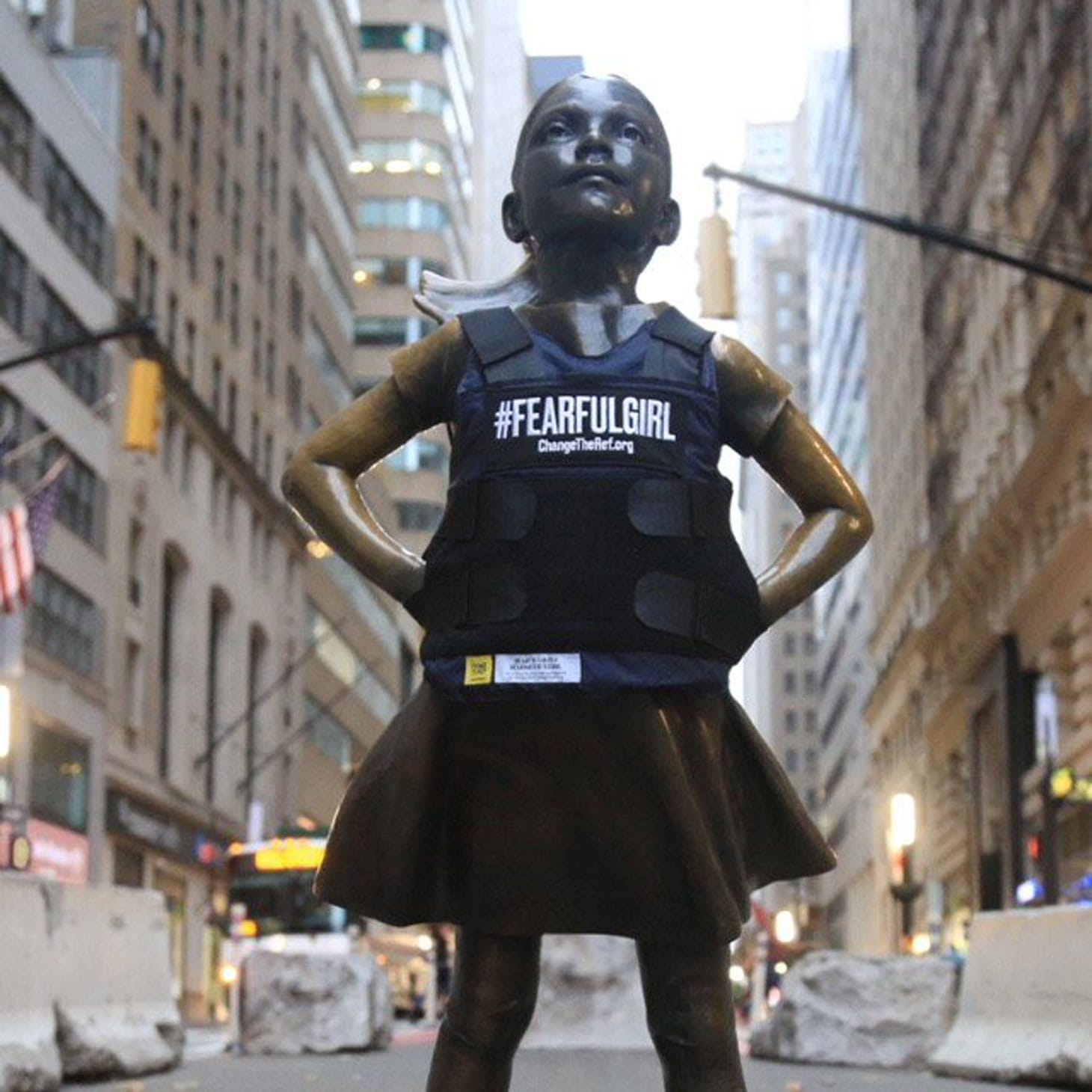 On Friday, November 2, the infamous “Fearless Girl” statue outside New York’s Wall Street donned a bulletproof vest brandishing in bold letters, “#FearfulGirl.”
