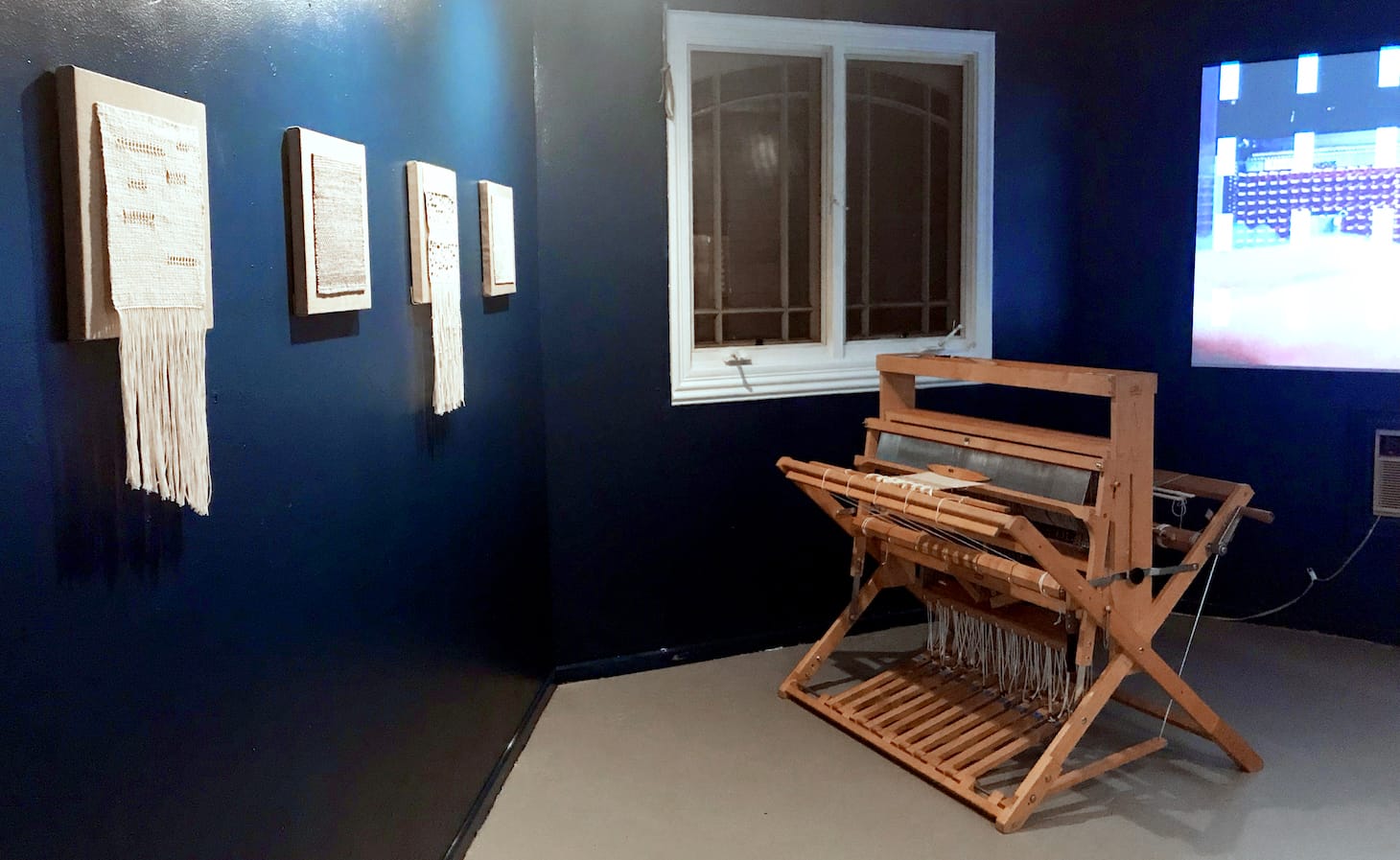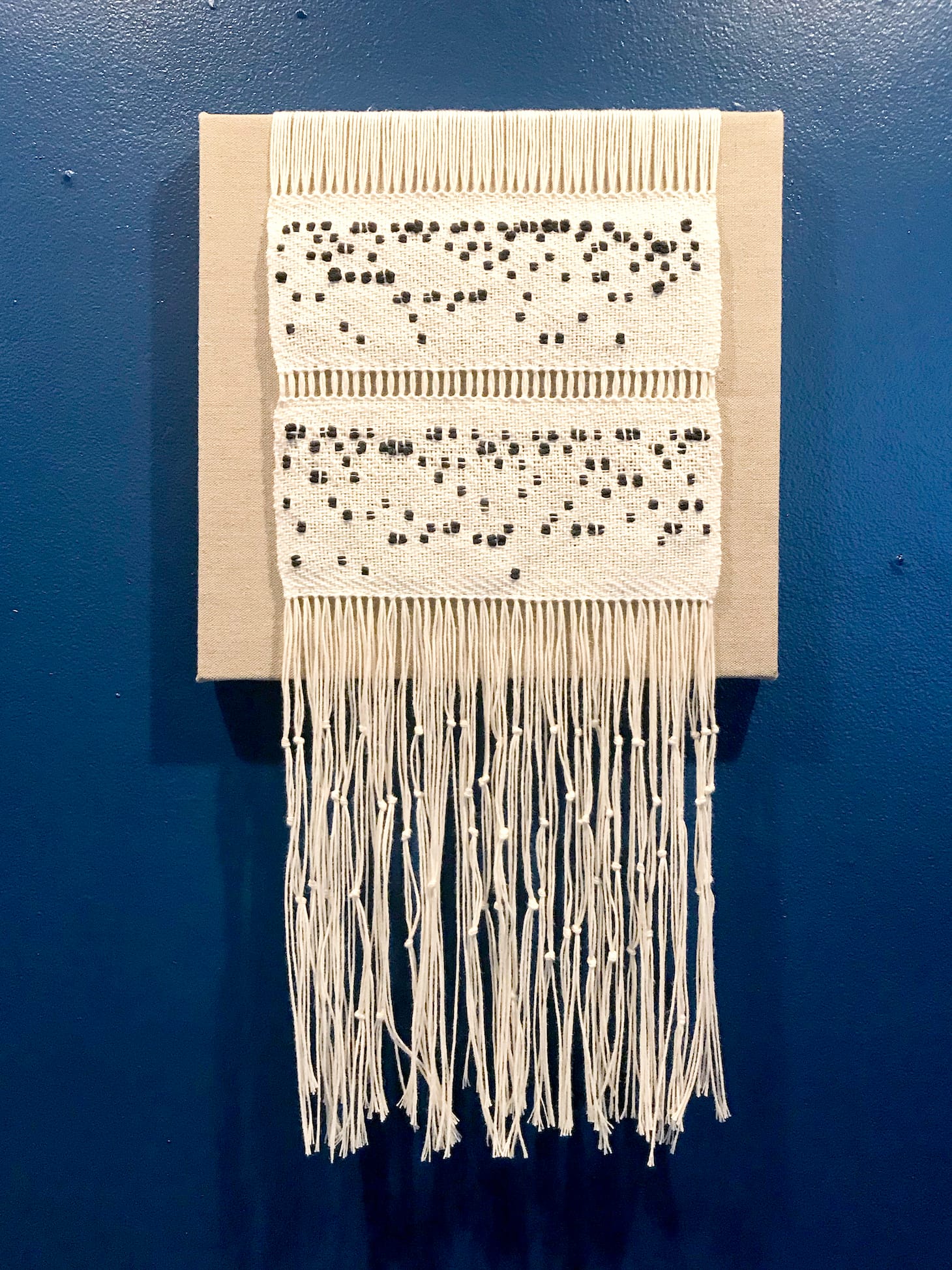 In a small room dominated by a loom, Lee has hung weavings and projects a video created with a computer algorithm. Some pieces, which Lee mounts to canvas blocks like paintings, have small, loose-knit holes dotted along in rows that look like punch-outs carved out of timecards. This is just one example of how Lee unites craft and computation.