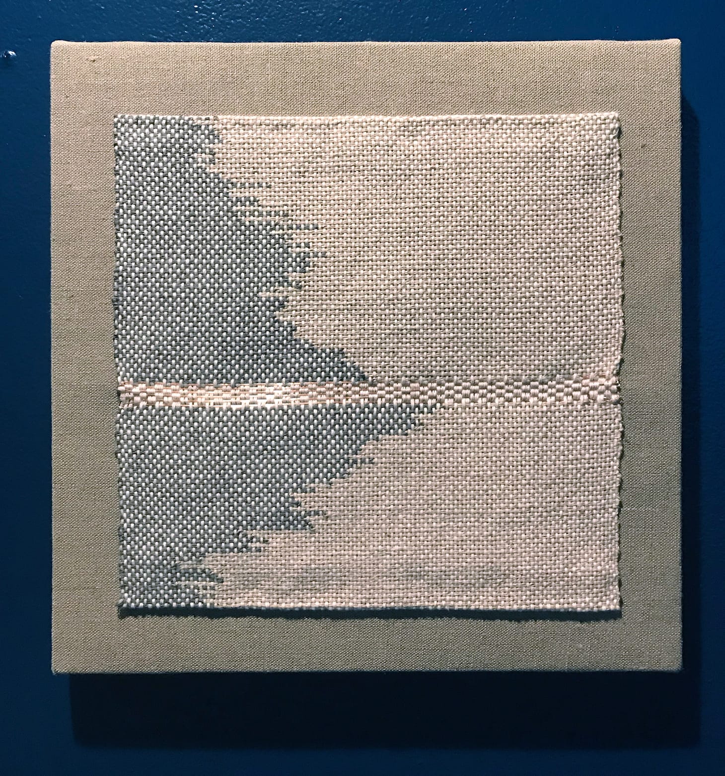 Another weaving, “Disrupting the Industry,” doubles as data visualization, showing the decline of women studying computer science. Covering a 44-year period, from 1966 to 2010, navy threads march horizontally along a grey background, reaching halfway across the upper third of the canvas before haphazardly retreating down the length of the weaving. Translation: significantly more women earned degrees in computer science in the 1970s than they did in 2010. A jarring, loosely woven stripe also interrupts the graph, a metaphor for the industry’s gender gap.